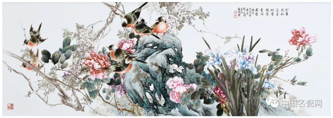 其作品中往往设色淡雅,行笔飘逸,深刻的表现出粉彩花鸟画的情调和韵味。观其画,正似在脱俗的意境中神游,更能体会其作的形超神越与画风昂扬。