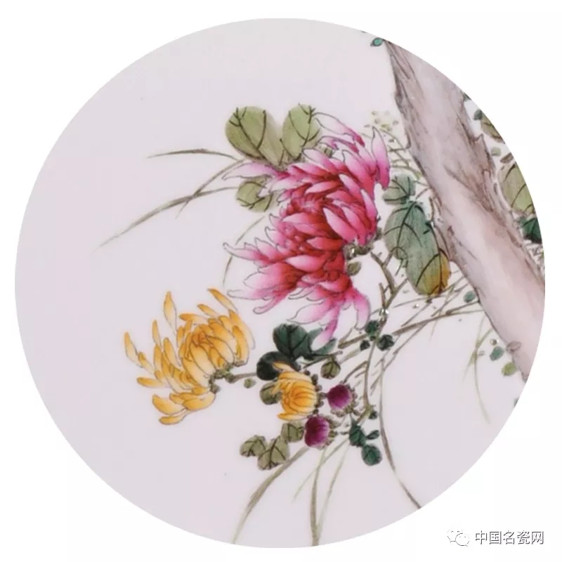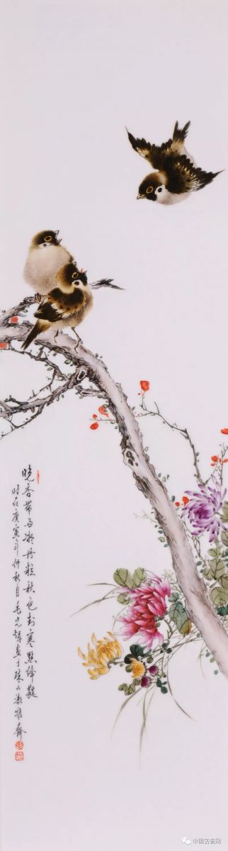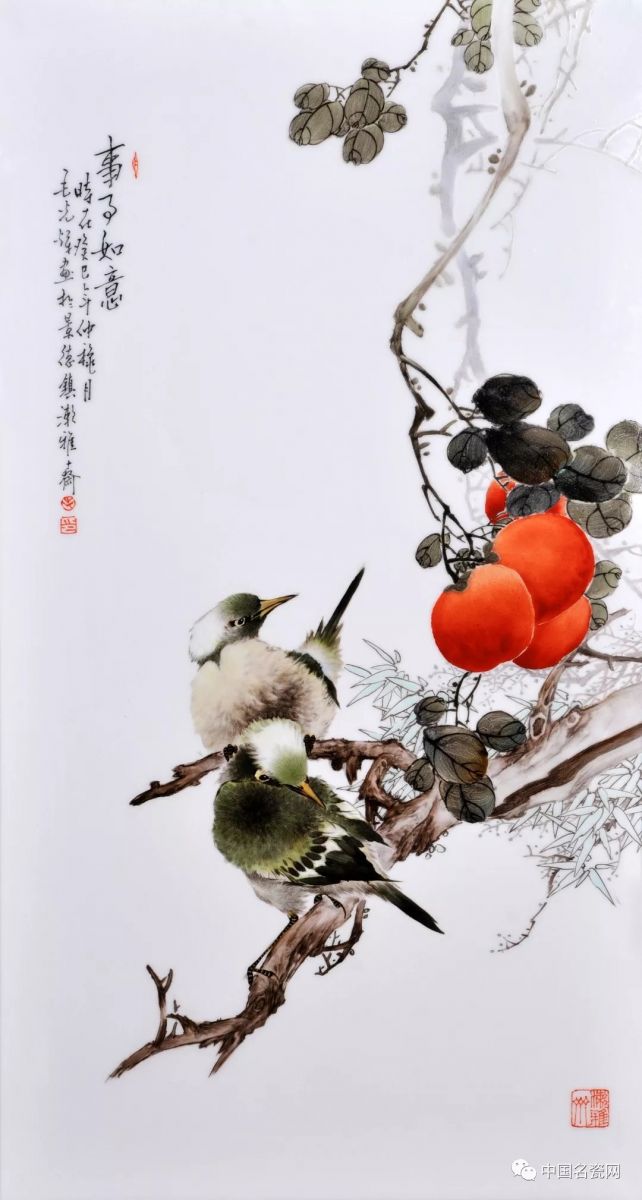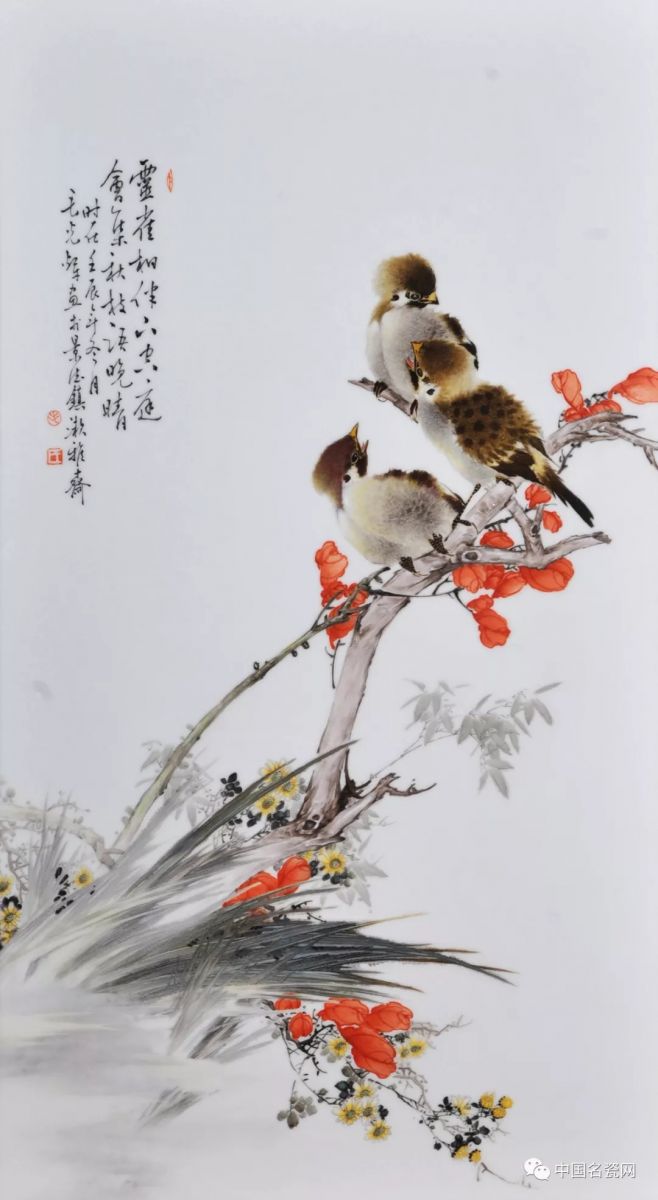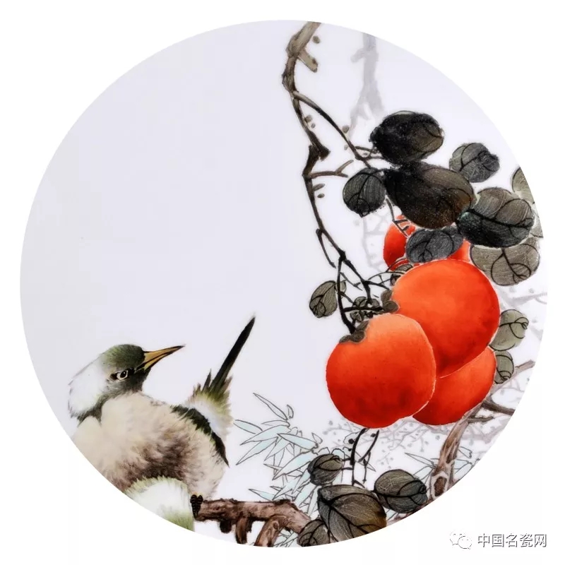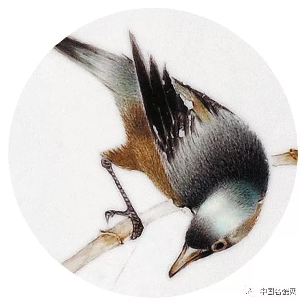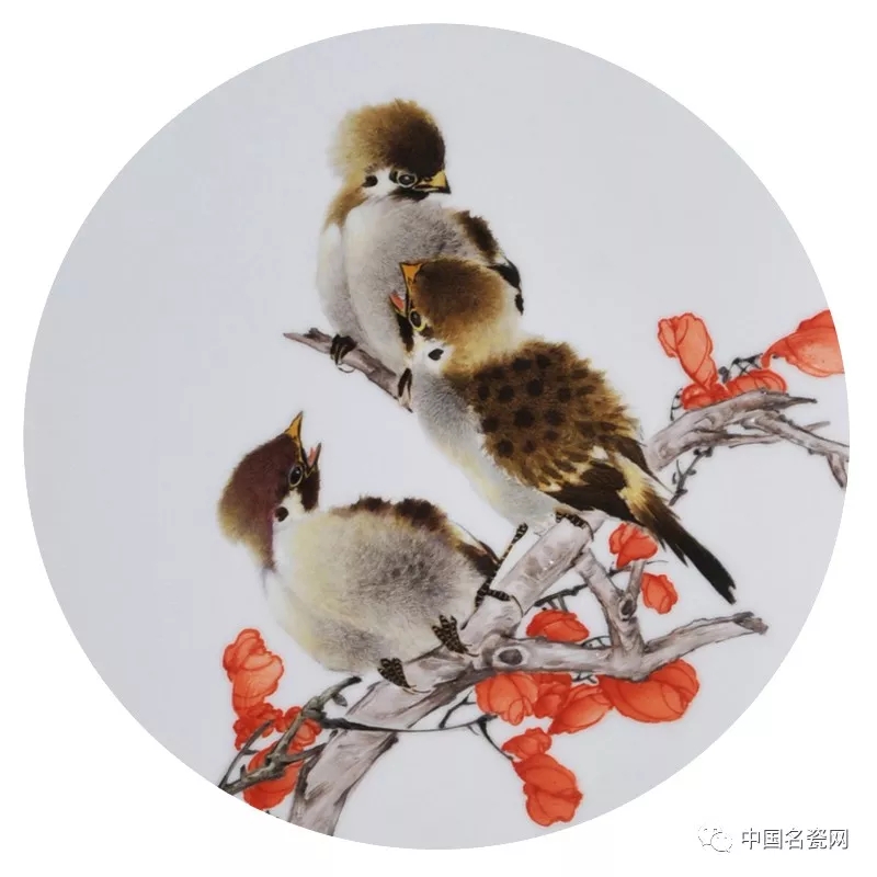 毛光辉的花鸟作品,设色艳丽,笔下飞鸟灵动鲜活,细节的处理、光影明暗的表现使画面更加写实,笔下生命跃然瓷上。