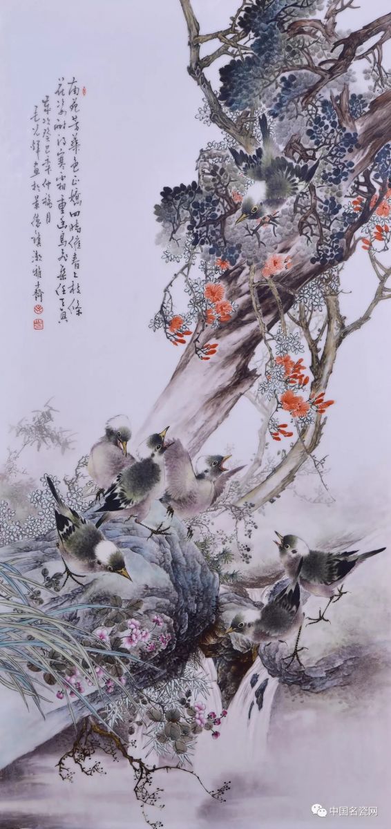 此幅《南苑芳华》,上虚下实,以树干成对角线将画面分开。下绘山石为实,于乱石中泄出一道急流,使人仿佛可听见潺潺流水之声。鸟立石上,姿态各异,有相望对鸣的,有自娱自乐的,还有展翅欲飞的。整体设色淡雅,鲜红的凌霄花跃然瓷上,布局上的主次分明,使得层次自然。细节的描写,将鸟的灵动与花草的鲜活,尽显于画面之上,整幅画面极富生活气息,一派生机。