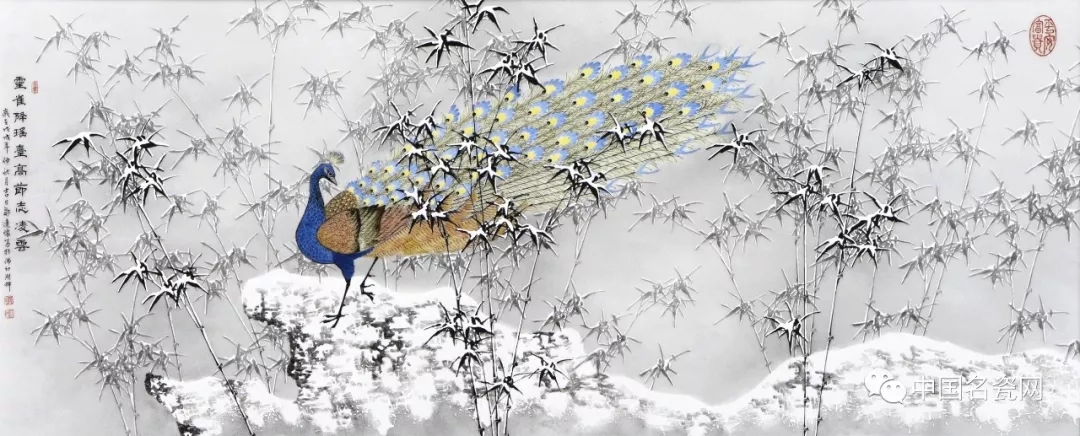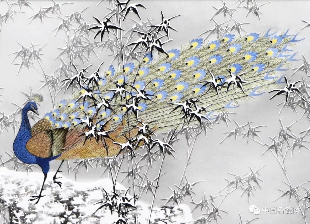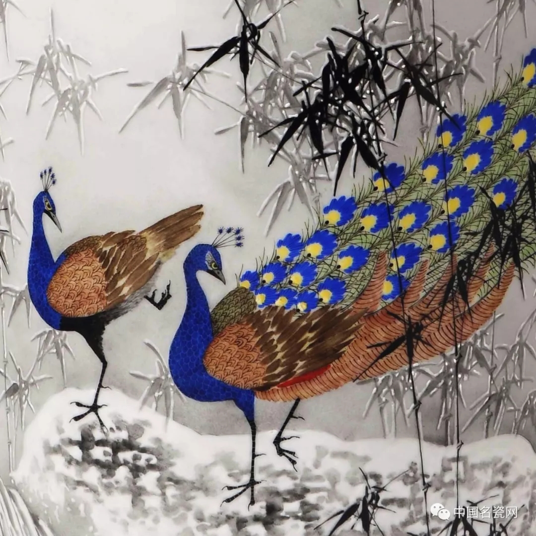 邹达怀 雪竹孔雀 瓷板(局部)