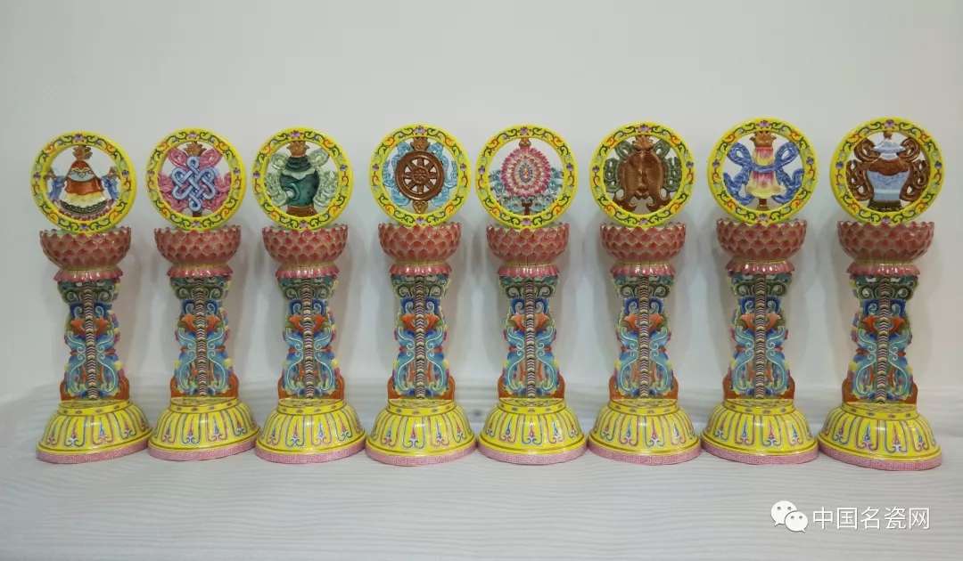 “八吉祥”指8种佛教法物,即轮、螺、伞、幢、花、罐、鱼、肠,是佛堂里的供器,品种以景泰蓝为多,而粉彩的八吉祥瓷器十分少见。与传统粉彩不同的是,此“八吉祥”每一件法物都被制成两面对称的镂空雕塑。