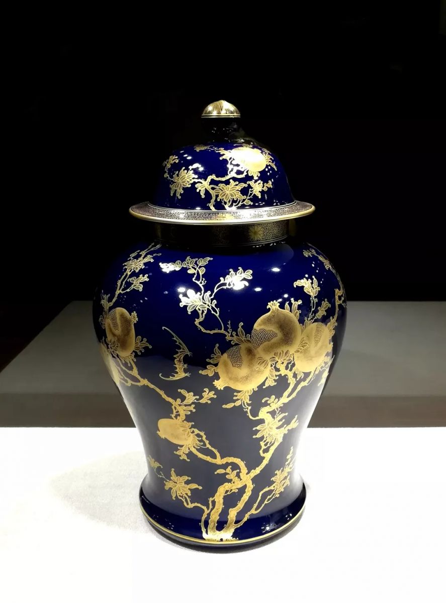 研究院所作此罐,整器造型规整周正,蓝釉色如深海,呈色稳定,釉面匀净,制作精良。通体施霁蓝釉,以金彩描绘通景式石榴纹图案色泽妍亮深沉,宝光内蕴,端庄挺拔,气息神圣,美得大气磅礴。
