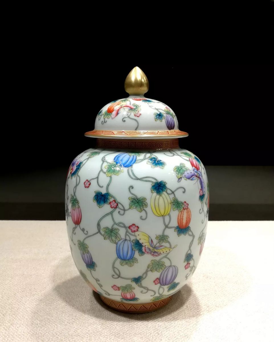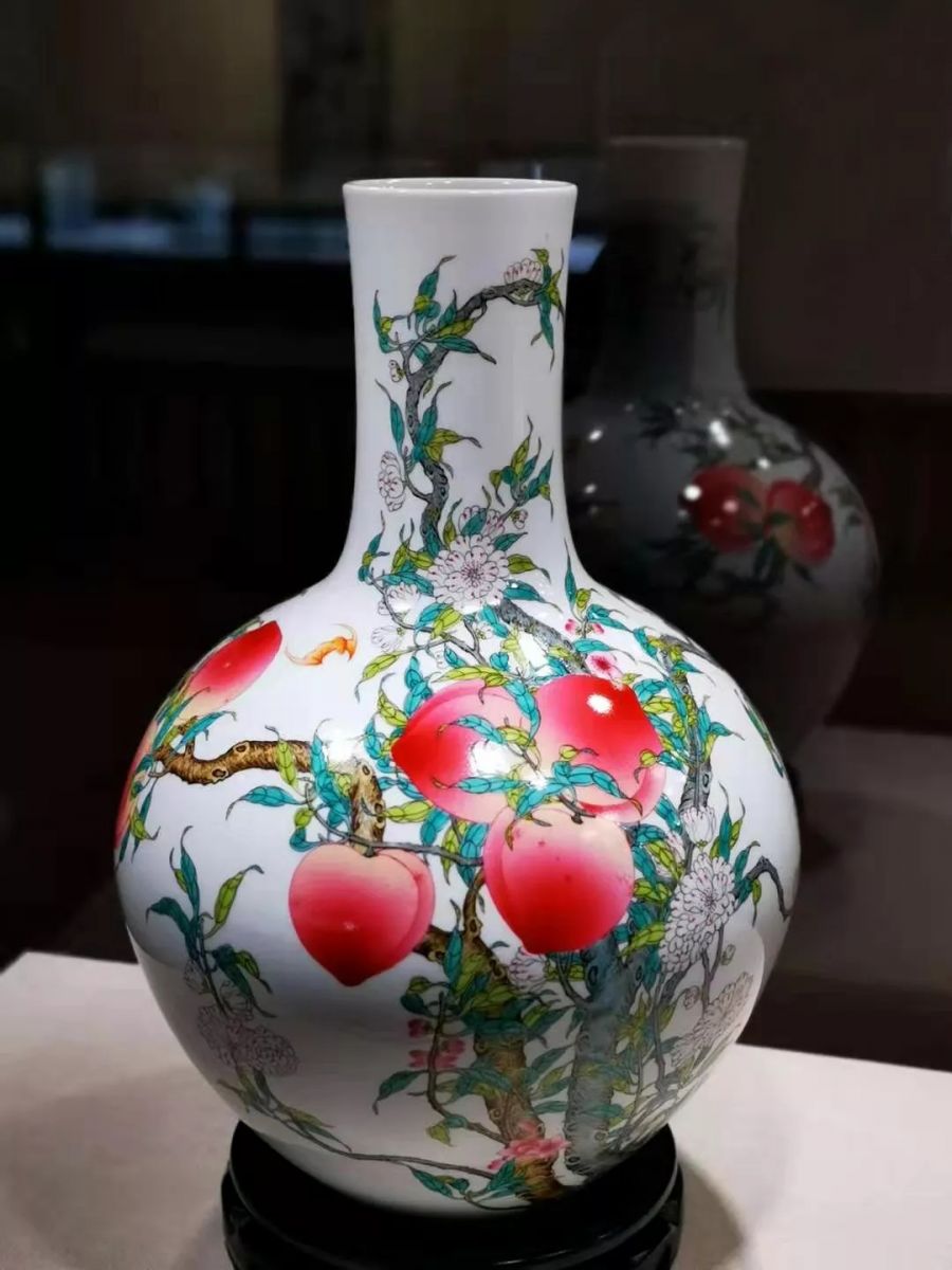 研究院复烧出的粉彩九桃天球瓶,运用渲染手法绘画桃实,桃实饰彩浓厚,成功地表现出成熟桃实的娇艳色彩,构图疏密有致,形成叶有阴阳向背、树有老枝新芽的效果,再现了乾隆粉彩大件器物的代表作品。