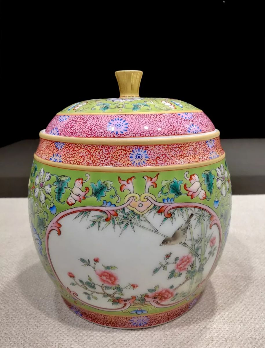 研究院所作此尊,口沿呈直壁状,颈微束,腹扁圆,平底。通体以粉彩绘锦地缠枝百花纹,颈部及腹部开光,绘春秋四序花鸟。其布景有序,描绘工细,敷色精到,匠心独运,既继承了御窑厂粉彩之传统,又拓宽了景物合一,情景交融的艺术表现领域。
