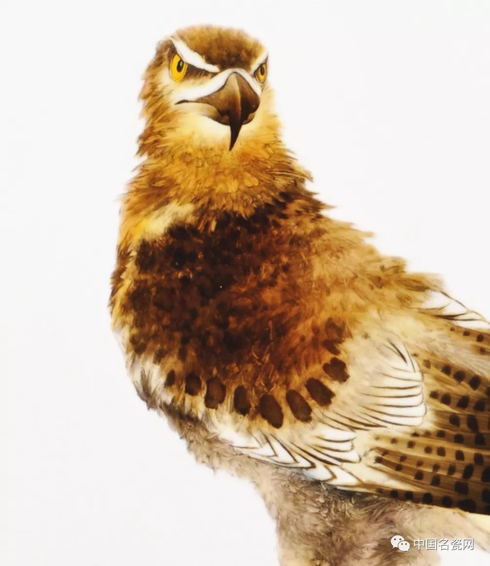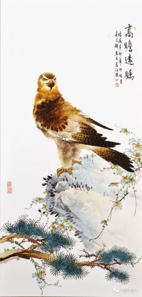 鹰是一种食肉类大型猛禽。画鹰难的是画出它的雄健粗犷、强悍勇猛的气势,因此,用笔应果断、泼辣、奔放。毛光辉笔下的雄鹰喙尖爪利,目光如电,息翅站立则高瞻远瞩,展翅飞翔则搏击长空,笔力凌厉,一气呵威,刻划出了鹰的威风凛凛,无所畏惧的王者风范,既有大写意的纵横恣肆,又有工笔画的精致细腻。