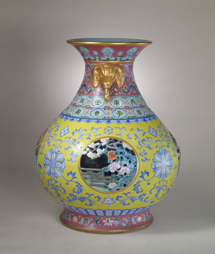 乾隆黄地粉彩镂空干支字象耳转心瓶