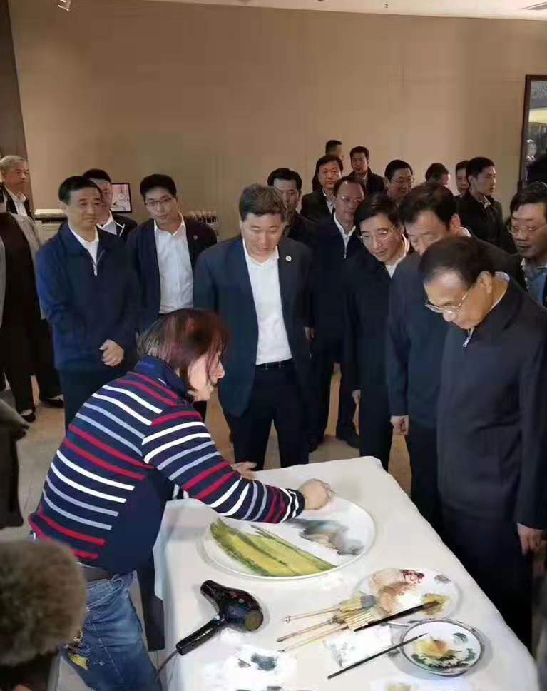 视察期间,我院学术委员会委员、中国工艺美术大师赖德全现场为李克强总理展示了瓷画创作。