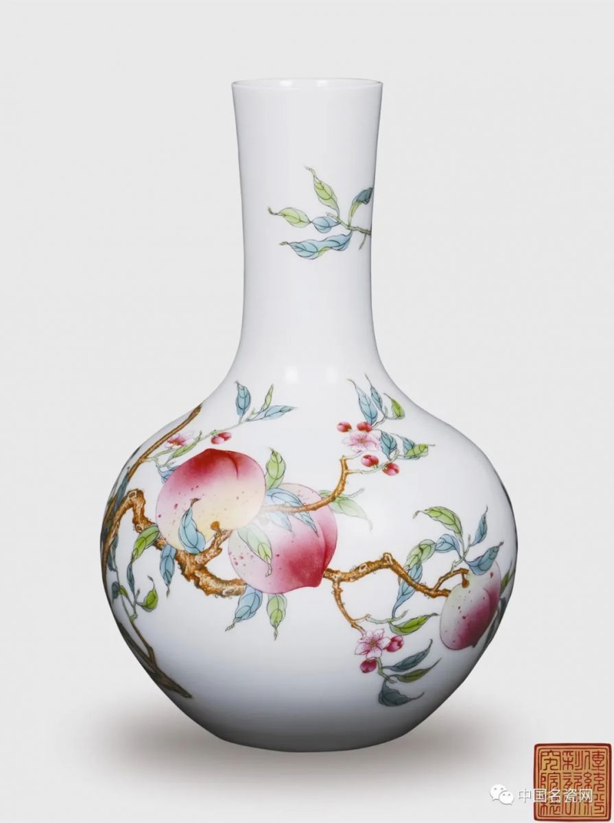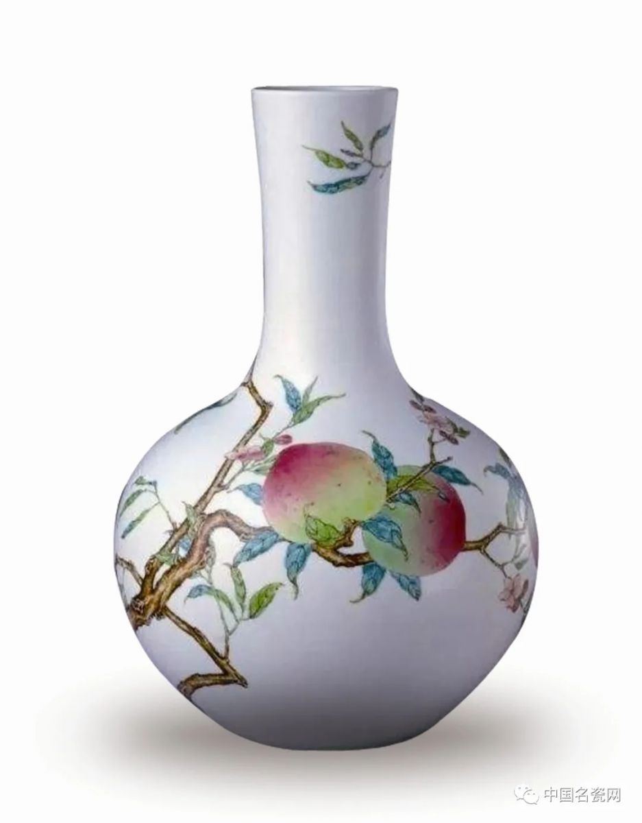 ....天球瓶原名“千秋瓶”,象征着“千秋太平”之意,此种器形始见于明代永乐、宣德时期,流行于清代雍正、乾隆两朝。此瓶彩绘构图疏朗有致,釉色浓淡相间,绘画精细工巧,堪称雍正官窑粉彩瓷器的代表作。