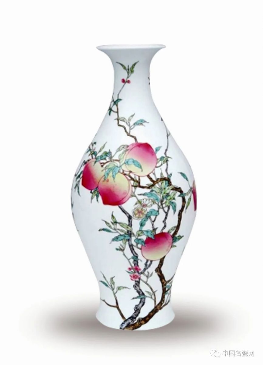 ....瓶直口微撇,浑圆腹,圈足。通体内外施釉。瓶体上以粉彩描绘桃树一株,枝繁叶茂,自瓶底沿腹部蜿蜒而上,六颗硕大饱满的桃实压坠枝头。