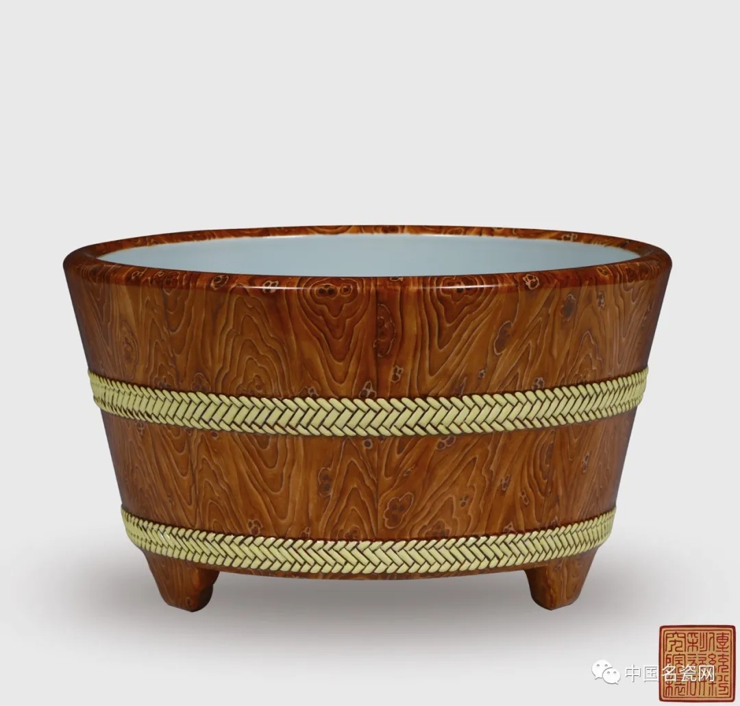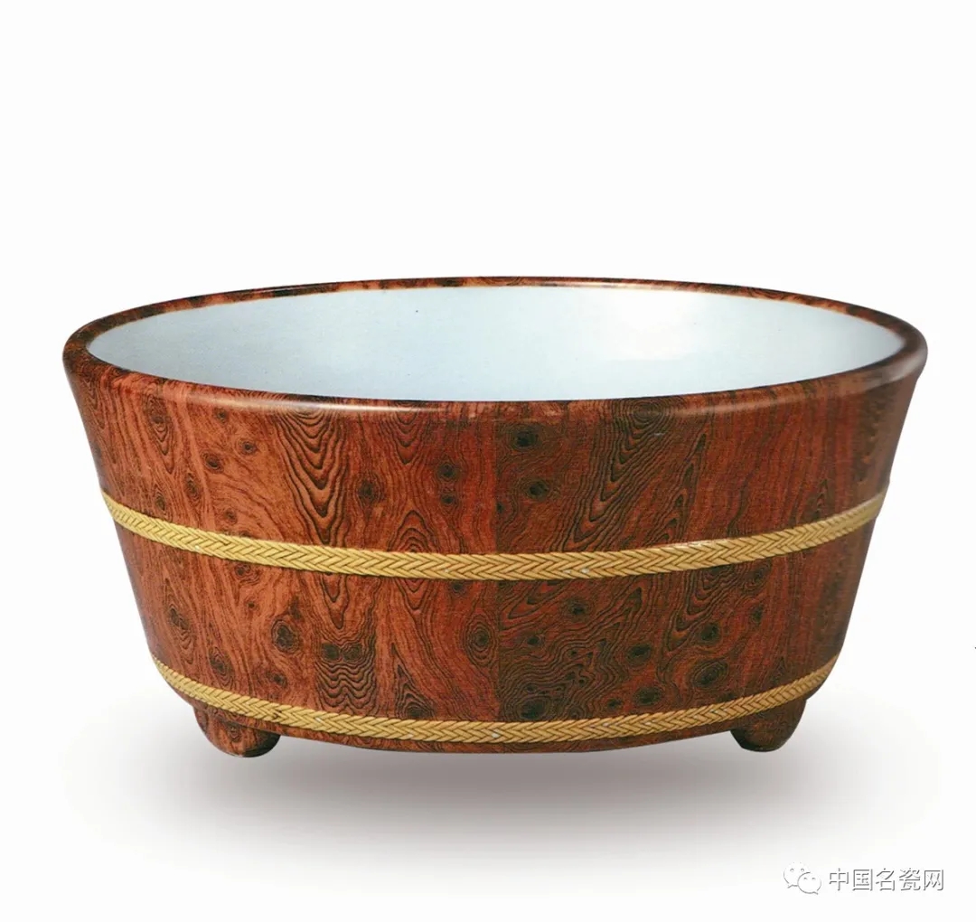 ....此盆为广口,斜直壁,平底圈足,器物通体描绘木板拼接的纹饰,仔细观之,还可以看出细密的木制纹理,形象逼真,精工细致。其最惟妙惟肖之处在于盆中、底部描绘花绳纹,用黄釉仿竹篾形箍,以达到用绳子箍木盆之外观。