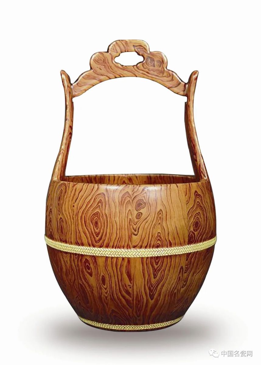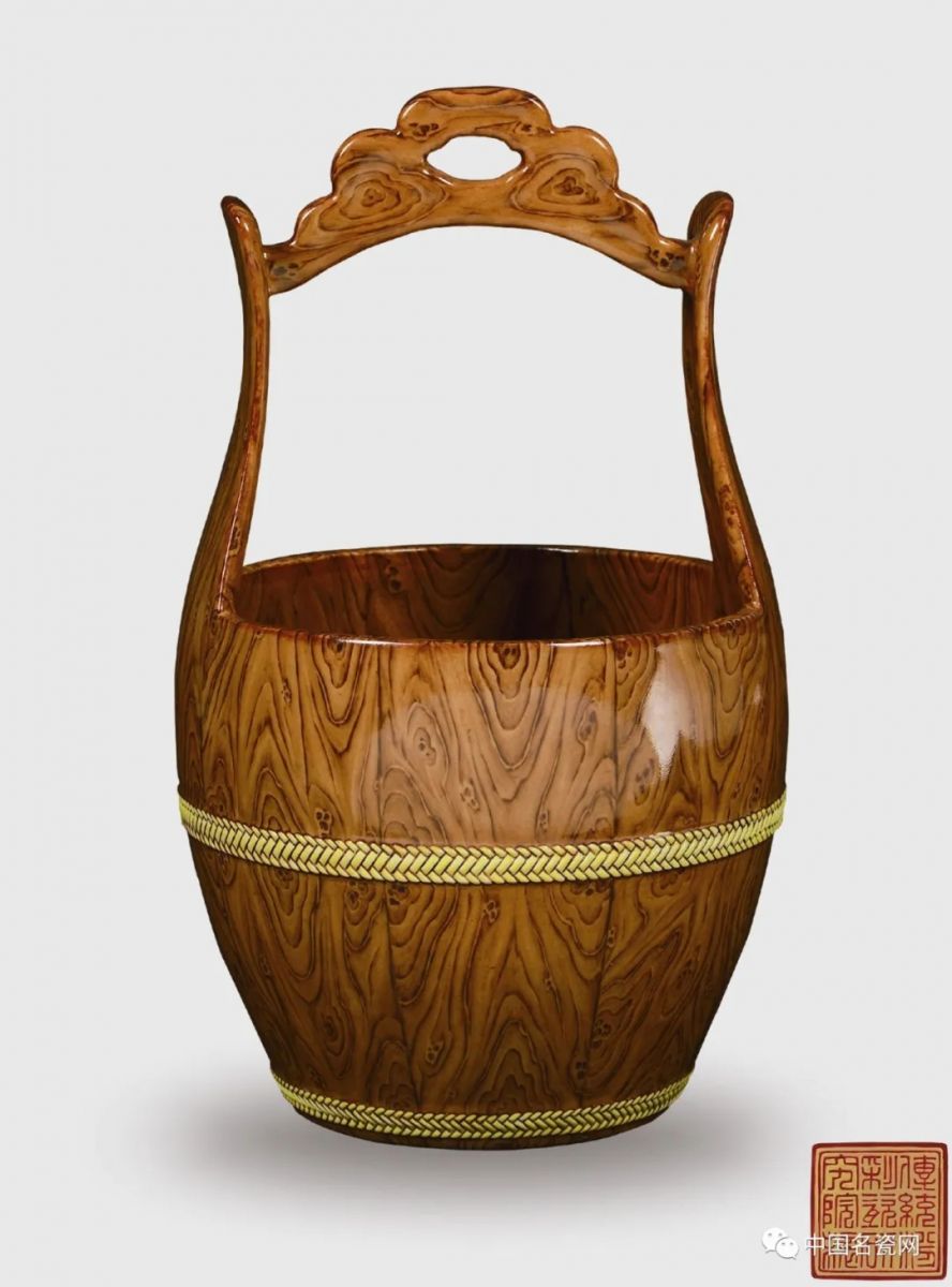 ....桶身胎体沉稳,釉质滋润。桶内外壁遍施木纹釉,腹部、胫部塑两条黄釉仿竹篾形桶箍。纹饰造型宛如木制提桶,工艺精良,惟妙惟肖。寓意“江山一统”,为清宫重器。