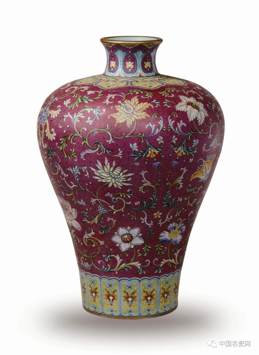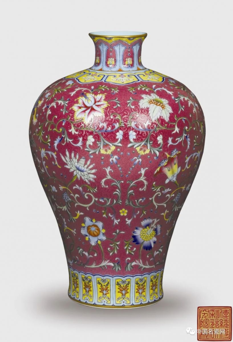 ....其胭脂红地流光溢彩,轧道剔划精细流畅,花卉缠枝用色考究,纹饰翻转有韵对称,厚薄调配得当,通体花团锦簇,色彩缤纷,叹为观止。