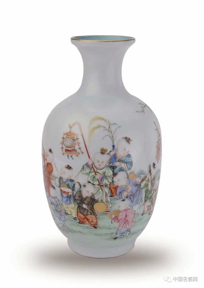 ....此作由“当代粉彩官窑”景德镇市传统粉彩瓷研究院成功复烧。婴戏图是中国传统的吉祥图案之一,用以描绘“黄发垂髫并怡然自得”的桃园美景和太平盛世。婴孩人物描画丰满可爱,动态各异,形态逼真,栩栩如生。瓶内外壁均施透明釉,更显胎体洁白细腻,画面用色鲜艳明丽,画工精美细致,给人以喜庆欢乐的美好祝福。