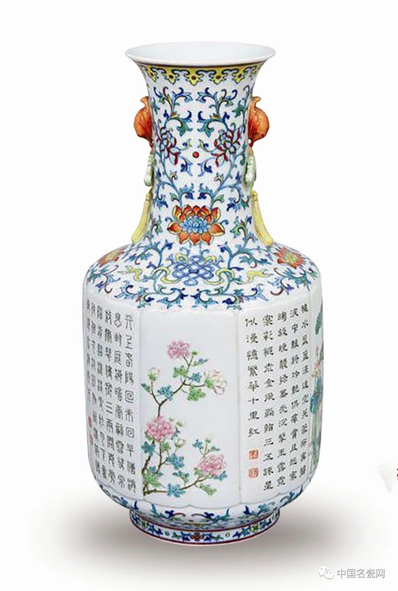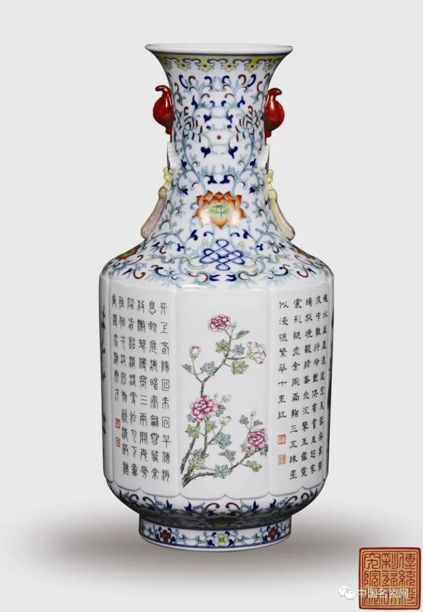 ....此瓶撇口,折肩,圈足,长颈上贴附两耳,作红蝠噙玉磬式。腹部开光,内依次以粉彩装饰诗句和相应的花卉图案。颈部和足部以斗彩绘缠枝莲花和佛教八宝之一的盘长结。粉彩和斗彩两种对温度等要求不同的工艺运用于同一瓶上,体现了乾隆时期瓷器生产的高超技术。腹部装饰的四季花卉分别为牡丹、荷花、芙蓉和梅花,每幅花卉前都有对应的乾隆皇帝所作诗句,分别用楷、行、隶、篆四体书写。