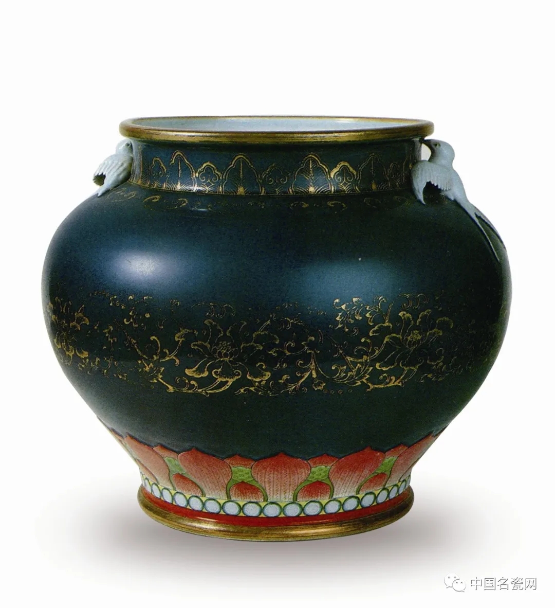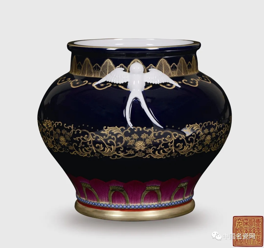 ....通体施霁青釉,圆口,卷唇,直颈,鼓腹,瓶底、口、沿、颈、肩、腹有本金彩线纹、蕉叶纹、如意纹、缠枝莲纹。足部饰粉彩凸雕莲瓣、莲实和连珠纹各一道,足底金彩线纹与口沿相互一致。尊身左右饰白釉海燕双耳,状极生动。此尊的工艺水平无论是胎料,底釉,烧制,着色,上彩都达到了前所未有的高度。