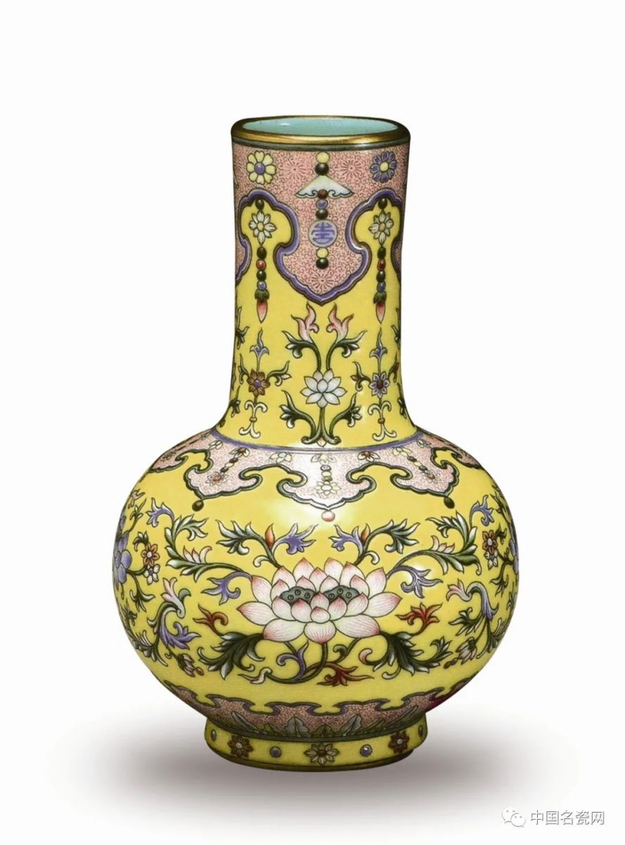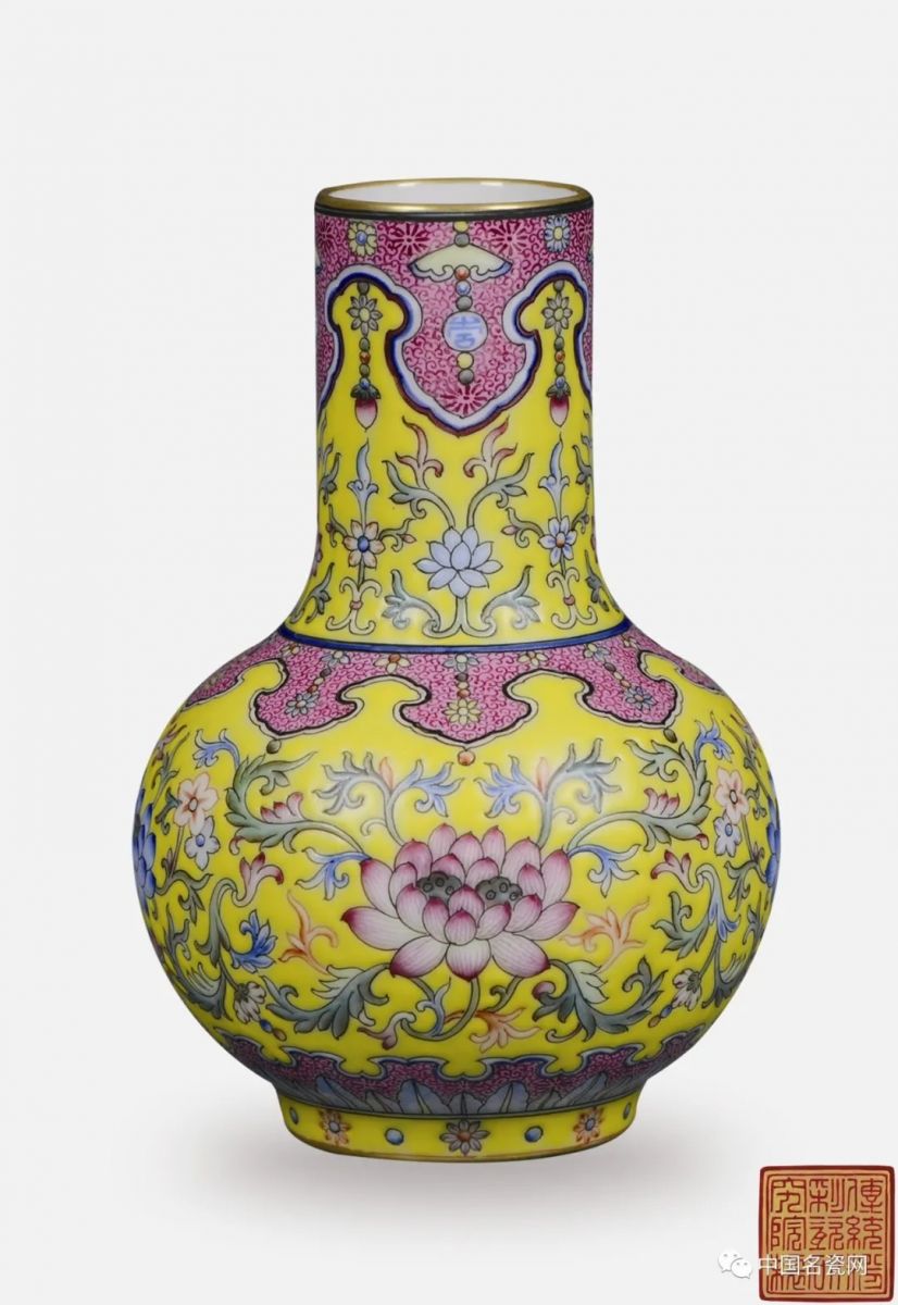 ....据清宫档案记载,本器出自乾隆七年(1742年)。纸槌瓶通体施黄釉,口、颈、底边各绘红地描金如意形锦地,边线均钩画蓝边,口径的如意纹锦地上并加彩绘磬纹、寿纹及璎珞纹;底边则加蕉叶纹等;颈部白地上饰番莲朵花,腹部主纹为四组蓝红相间的同心并蒂番莲花,圈足亦画花卉一圈。口沿、足底描金,胎薄轻巧,底部及内颈施湖绿釉。