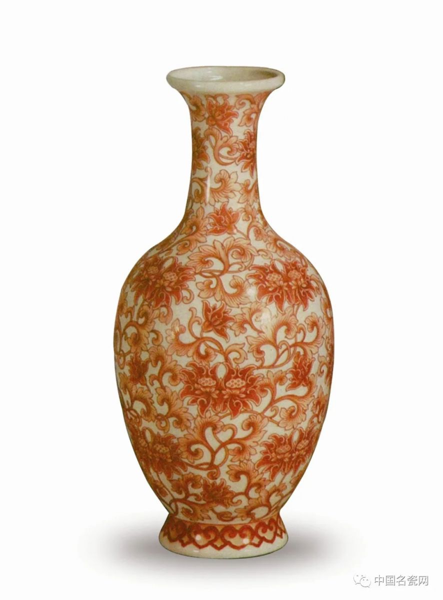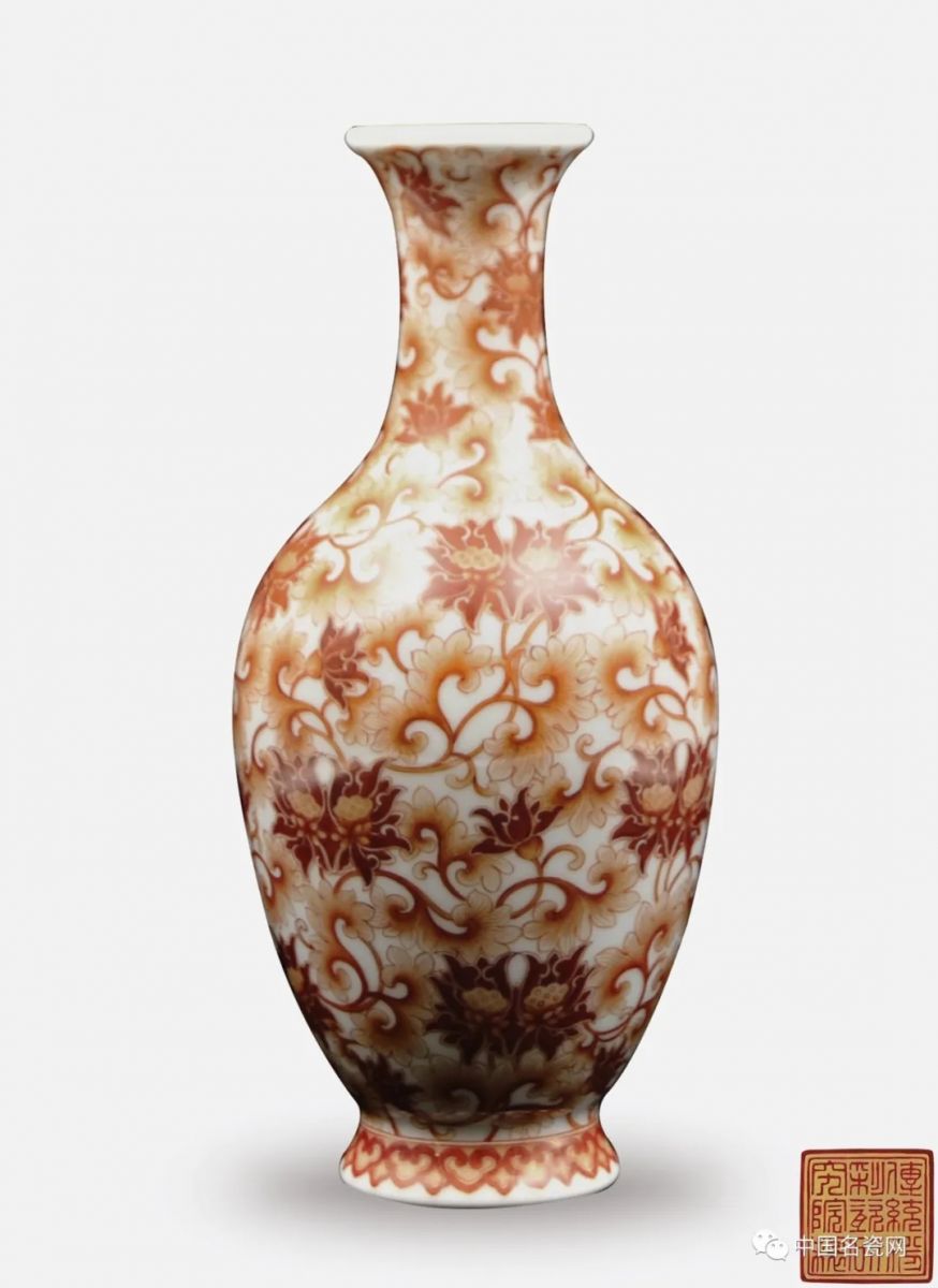 ....本藏品矾红缠枝莲纹瓶,又称矾红彩唐草纹瓶,由“当代粉彩官窑”景德镇市传统粉彩瓷研究院成功复烧。瓶身所绘缠枝花卉,明暗清晰有序,色调柔和。矾红彩发色妍丽,且浓淡有别,令花叶明晦有姿,层次宛然,焕目可观也。其工艺精绝,对比原件更显清雅疏朗之感,堪称复烧之佳作,具有极高的艺术价值和收藏价值。