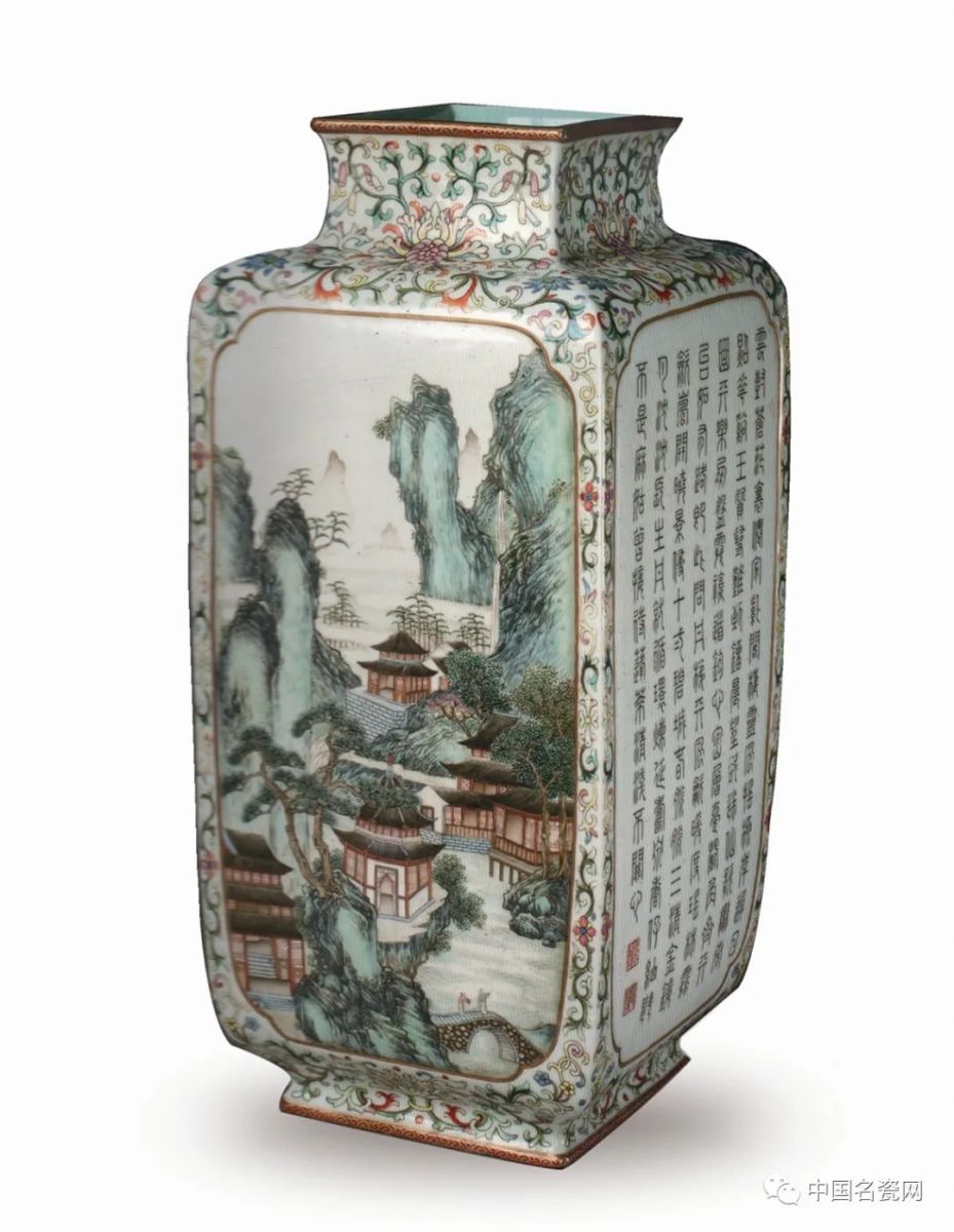 清乾隆 粉彩开光山水诗句方瓶