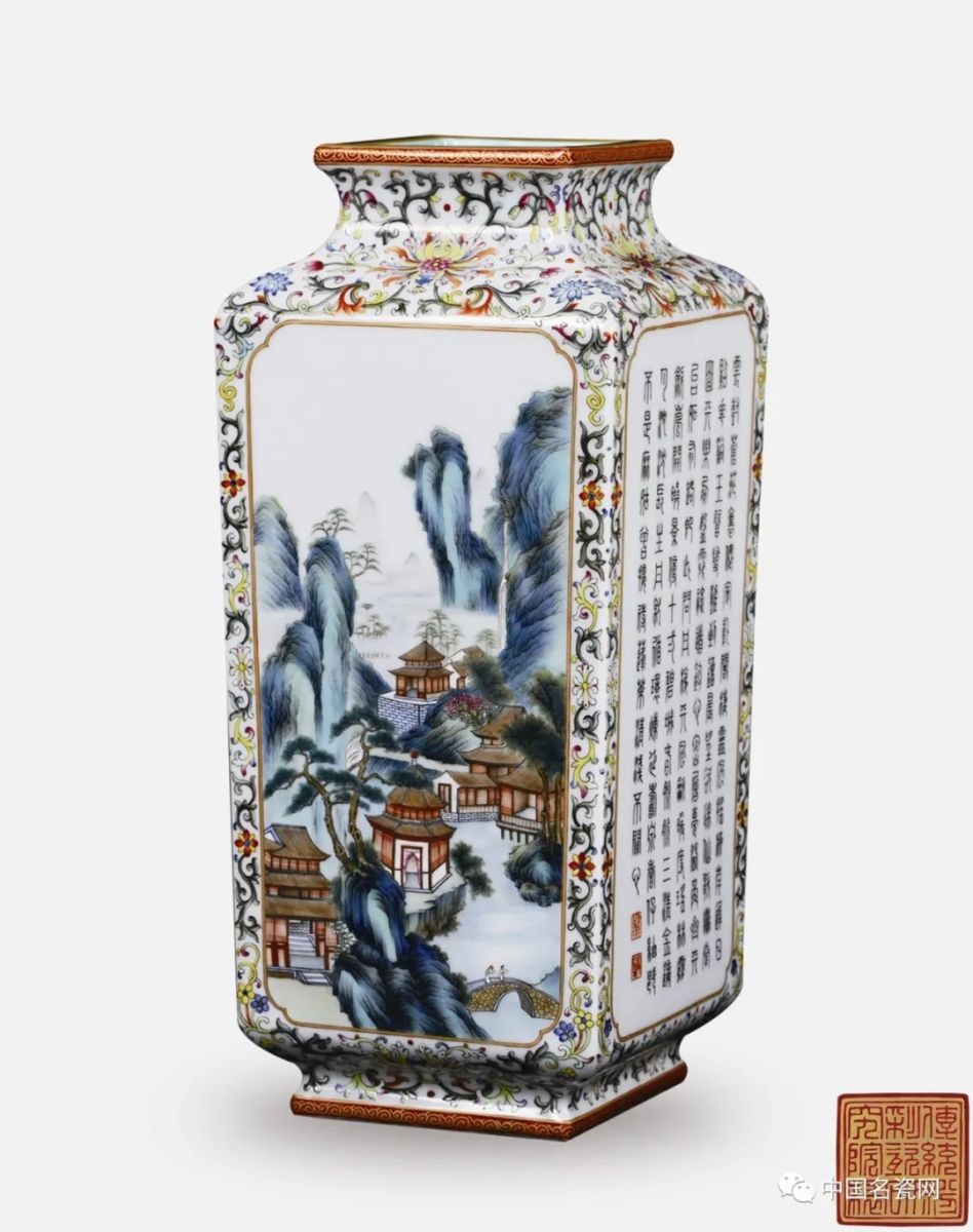 研究院 粉彩开光山水诗句方瓶