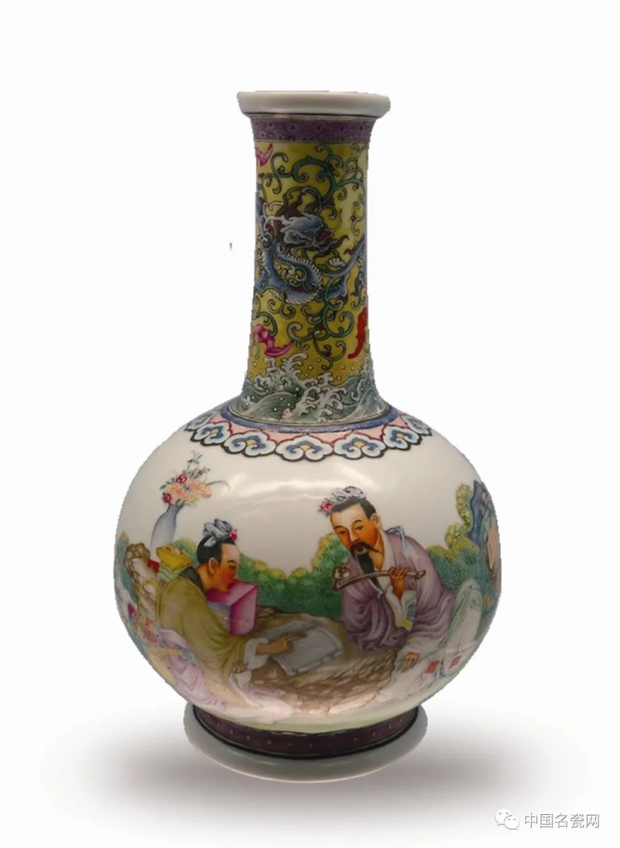 ....此瓶敞口外撇,细长颈,圆腹。口沿、口内、腹部、圈足外沿及底均为洁白色釉,颈部黄釉为地,绘珐琅彩海水龙纹。龙身四周有胭脂红彩蝙蝠五只。腹部白釉地上以珐琅彩画人物及山石花卉景色,主题为张良狙击秦始皇未中,更姓名隐匿于下邳,得圯上老人授《太公兵法》的传说故事。