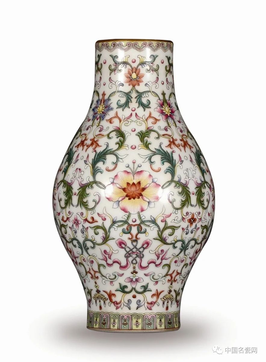 ....瓷瓶形制儒雅秀美,器身满饰缠枝莲纹,繁而不乱,精而不板,甚有宫廷艺品之皇家风范。乾隆时期彩瓷上的花卉图样中大量使用一种花与叶均变形的“洋花”图案,称“勾莲”或“缠枝莲”,茎蔓缠绕,花叶连绵,格调新颖,前所未有。此器为乾隆官窑彩瓷中的佳品。