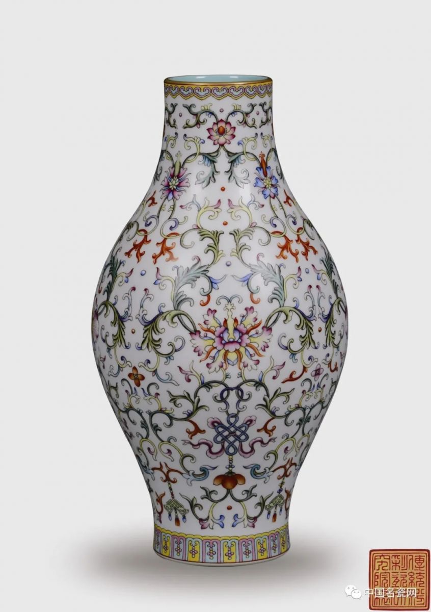 ....本藏品由“当代粉彩官窑”景德镇市传统粉彩瓷研究院成功复烧,橄榄瓶造型简洁明快,线条流畅优美,瓶口装饰如意纹,瓶身主题描绘缠枝花卉、吉祥结等吉祥纹饰,寓意富贵连绵,吉庆平安。