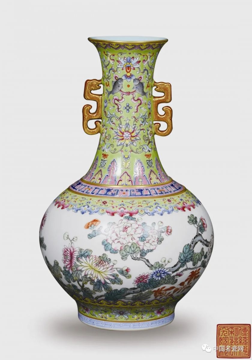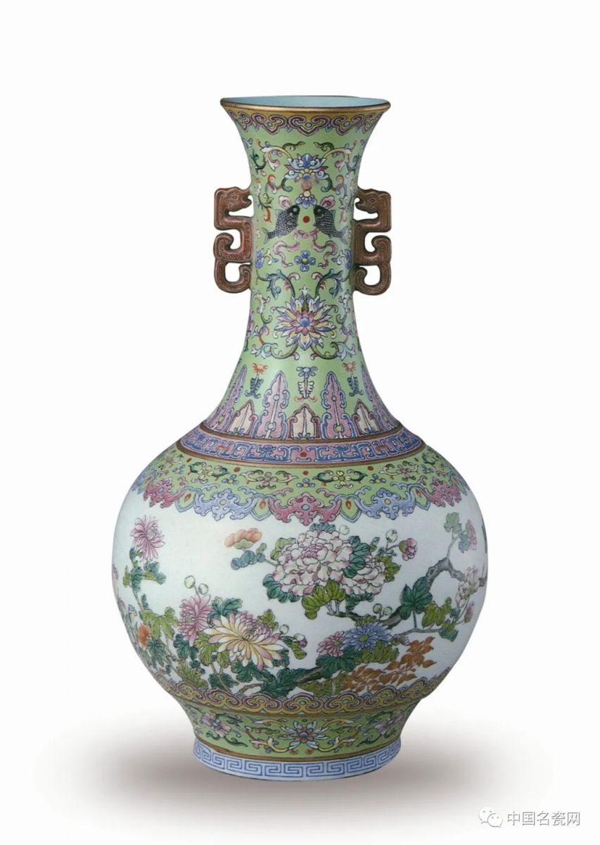 ....此瓶两侧双螭耳,口部外撇,弧度恰到好处,整个颈部线条内敛柔美。颈、肩、足部施翠绿釉为底,分别绘如意纹、蕉叶纹、缠枝花卉纹、蝙蝠纹和双鱼纹等吉祥纹饰。瓶腹部留白绘制盛开的菊花、牡丹,线条细秀柔美,画工精湛,细致入微,色彩搭配清丽雅致。