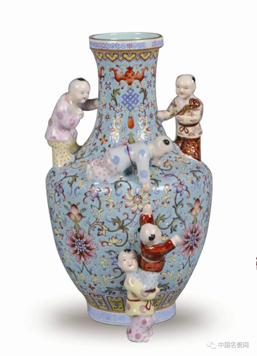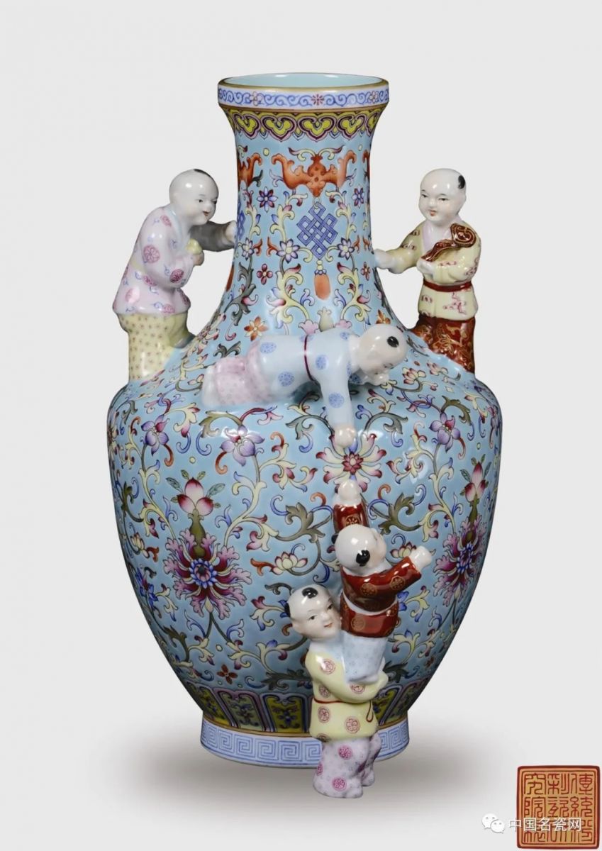 ....本藏品由有“当代粉彩官窑”之称的景德镇市传统粉彩瓷研究院成功复烧,整器施彩华丽,器型大方稳重,纹饰精美,捏塑婴戏相映成趣,妙不可言。其线条柔美,比例协调,釉色温润柔和,缠枝花卉疏密有致,五个童子天真烂漫。整体色彩亮丽,工艺精湛,寓意吉祥,极具艺术价值和收藏价值。
