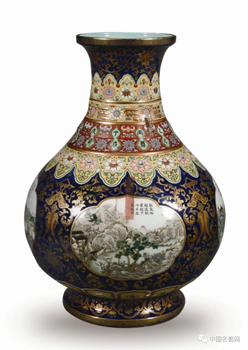 ....本藏品由“当代粉彩官窑”景德镇市传统粉彩瓷研究院倾全院之力成功复烧。瓶身通体满绘各式精美纹饰,腹部四面海棠式开光,开光内均为白地绘不同画面,有舟船竞渡、圆明园景色等,上方再以墨彩书与画面相应的乾隆御制诗句。工艺之繁复,实为《陶雅》所称之“华缛极矣,精巧之致,几于鬼斧神工。”令人叹为观止。