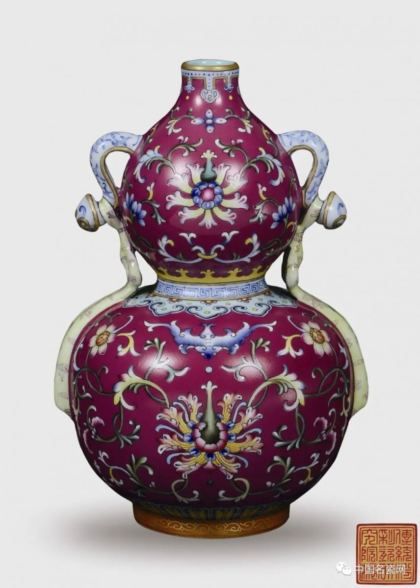 ....此瓶呈葫芦形,造型典雅,圆润饱满。瓶直口,短颈,束腰,圈足。通体施胭脂红釉,绘粉彩缠枝莲等吉祥图案。缠枝莲正面盛开,极富动感,肩部两侧各饰一如意耳,耳下坠苹果绿万字纹绶带,甚为飘逸,活灵活现。绶带自如意首缠绕,垂至瓶腹部,丝带飘逸,自然写实。乾隆官窑之琢器多喜置以双耳为装饰,尤其彩瓷几乎皆是,而且式样丰富,色釉多变。