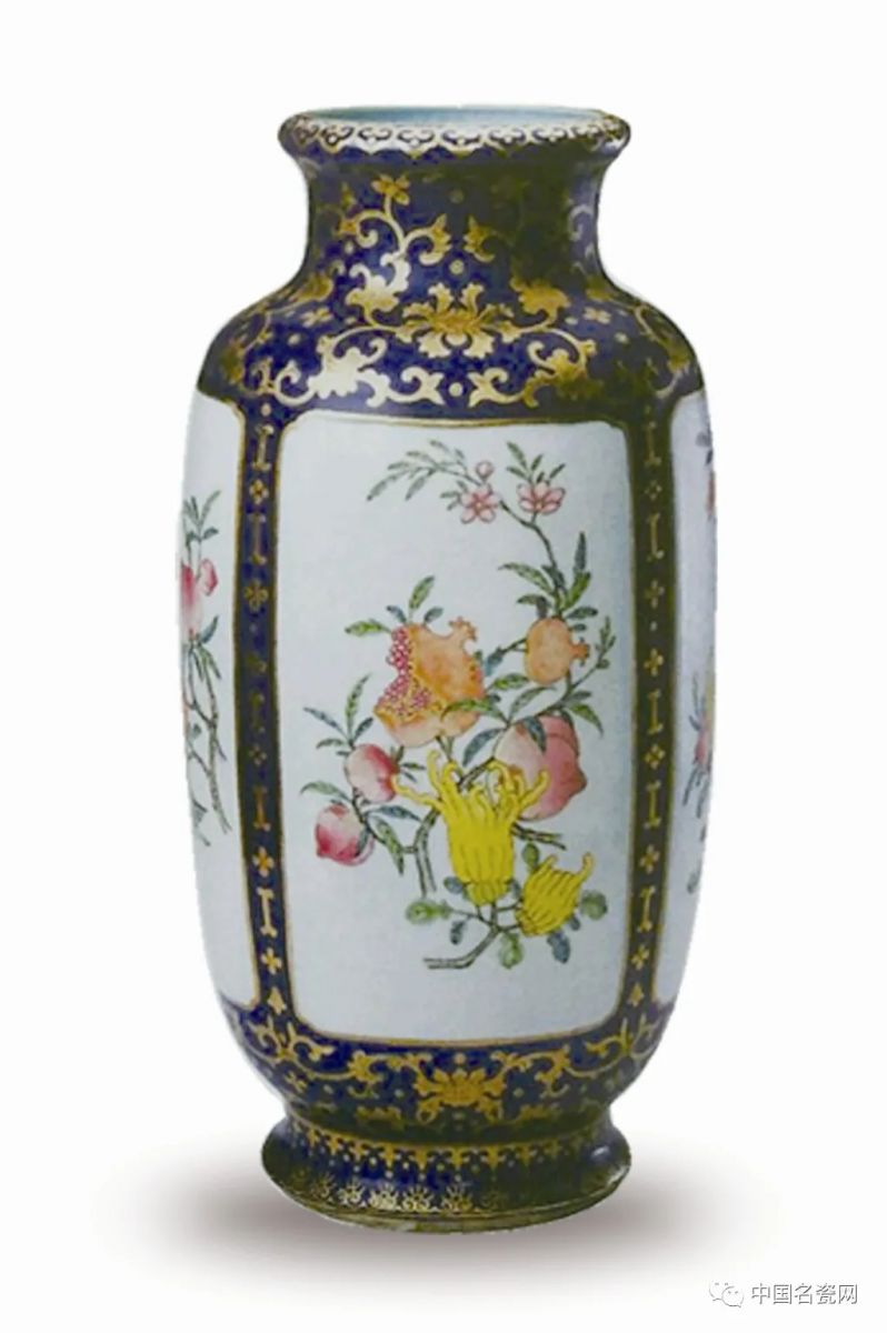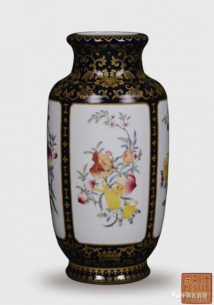 ....本藏品由“当代粉彩官窑”景德镇市传统粉彩瓷研究院成功复烧。三果纹,是瓜果纹的一种,寓意多寿、多福、多子,亦称福寿三多,多见于明、清景德镇瓷器上。此尊以三种瑞果为题材,绘石榴、佛手、桃子三种果实,取意祥瑞喜庆。造型秀美流畅,釉面匀净细腻,设色浓淡有致,笔墨染韵精微,制作工艺考究,绘画技艺成熟,实为乾隆粉彩器复烧的上乘之作。