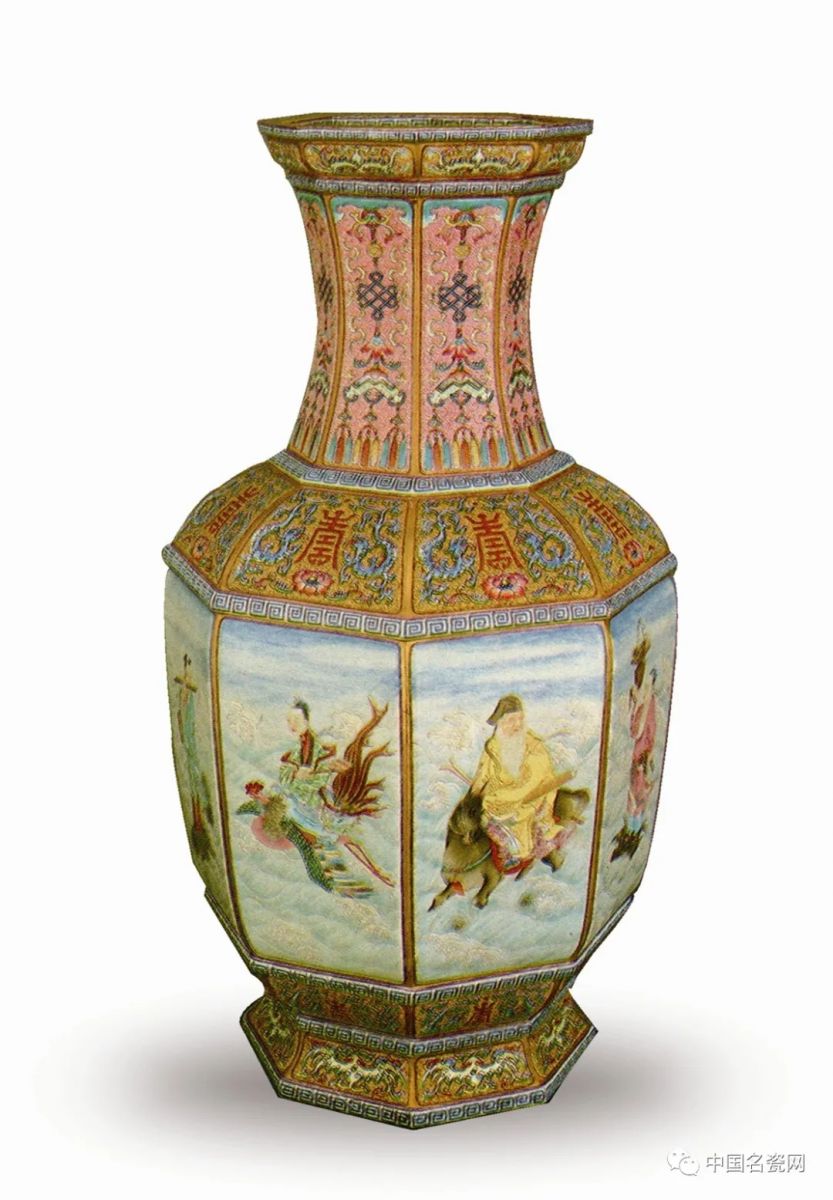 ....此瓶造型大气,八面均开光,分绘八仙各显神通,漂洋过海,展现出一幅幅想象丰富的神话画面。颈部饰带状锦纹,肩部为寿字、龙纹,施以蝙蝠纹装饰。此器物全身满彩,无一留白之地,深刻的表现了当朝瓷艺的繁华极致。
