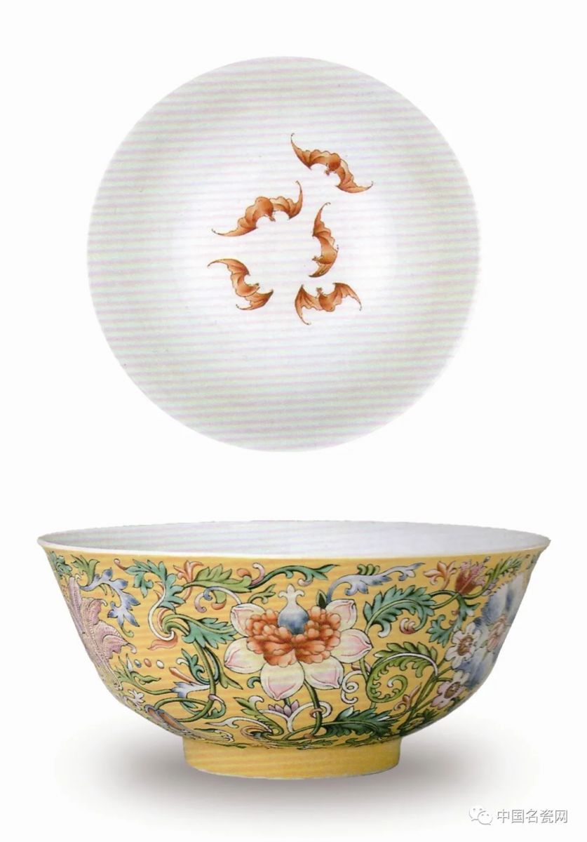 ....碗敞口,深腹,圈足。内施白釉,碗心红彩绘五只蝙蝠。外以黄地粉彩绘各式缠枝花卉。清宫内务府造办处档案亦称此种碗为粉彩黄地洋花宫碗,为皇家御用之物。