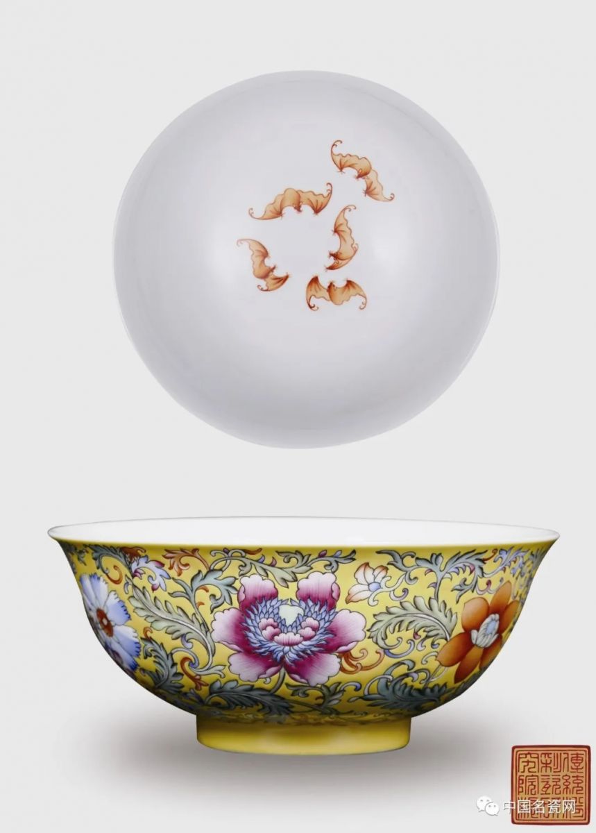 ....本藏品由“当代粉彩官窑”景德镇市传统粉彩瓷研究院成功复烧,碗身黄色地,通体满饰粉彩缠枝花卉等传统纹样,寓意吉祥富贵,碗心以红彩绘五只蝙蝠翩翩飞舞,寓五福临门之意。整体画工娴熟精湛,色彩富丽堂皇,纹饰细腻流畅,动感十足,极具艺术价值和收藏价值。