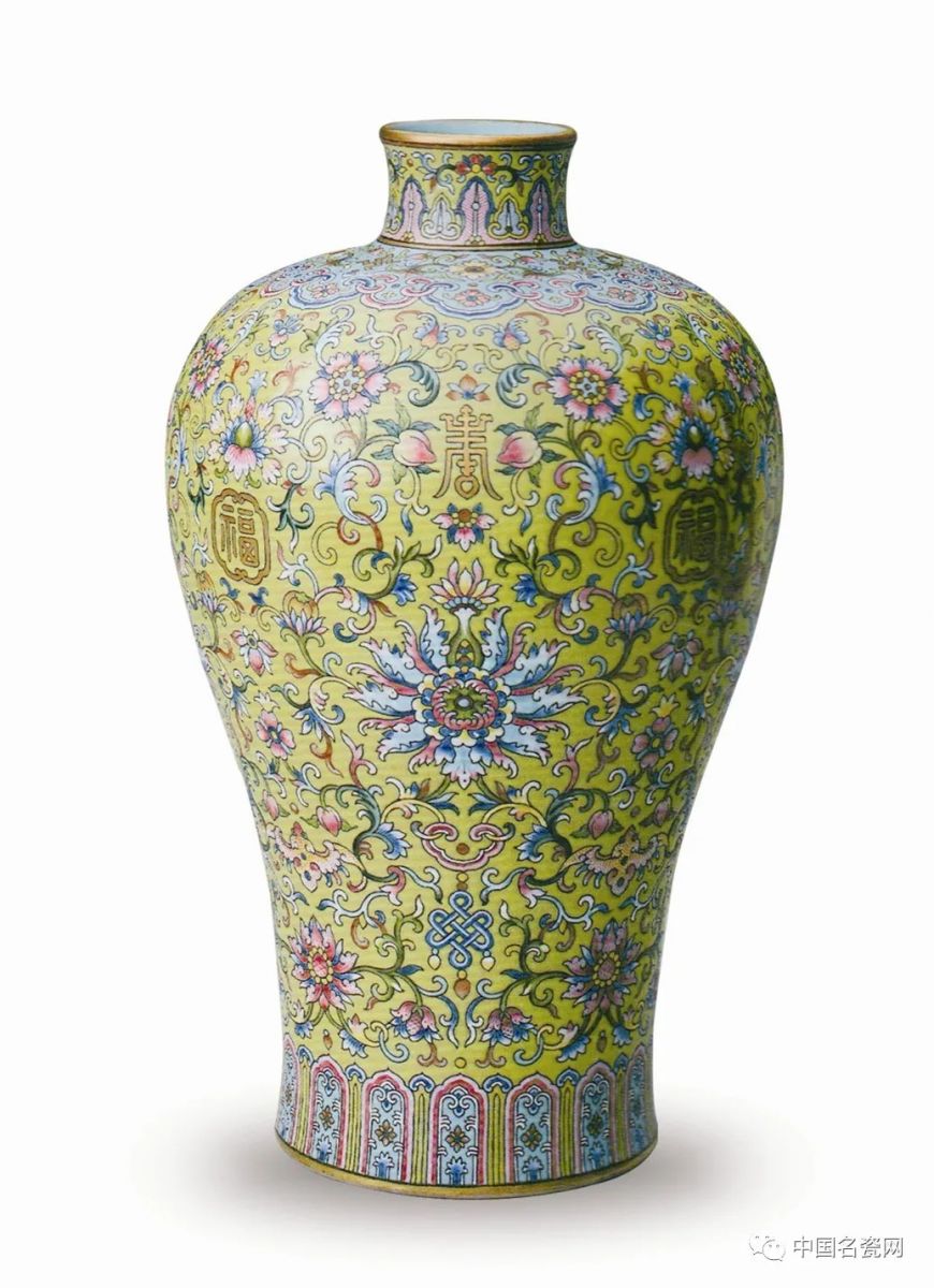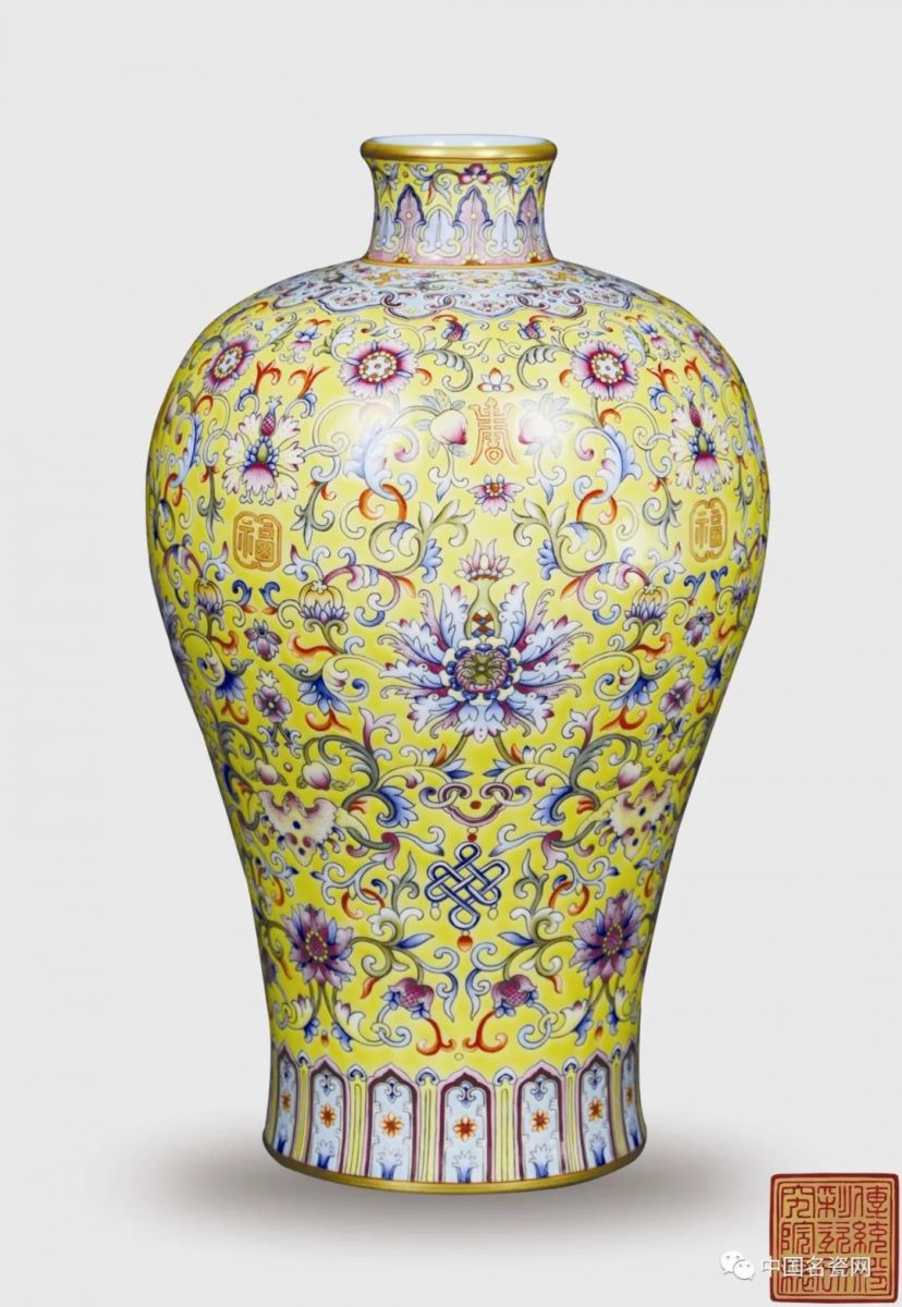 ....本藏品由“当代粉彩官窑”景德镇市传统粉彩瓷研究院倾力复烧成功,其釉面莹润,纹饰精美,色泽明艳,画工精湛。瓶身通体施绘福寿纹等传统吉祥纹样,满工全彩无一处留白,繁复程度令人叹为观止。底釉施代表皇家地位和风范之黄地,尽显富丽堂皇之感,为复烧清宫官窑器中的精品之作,极具艺术价值和收藏价值。