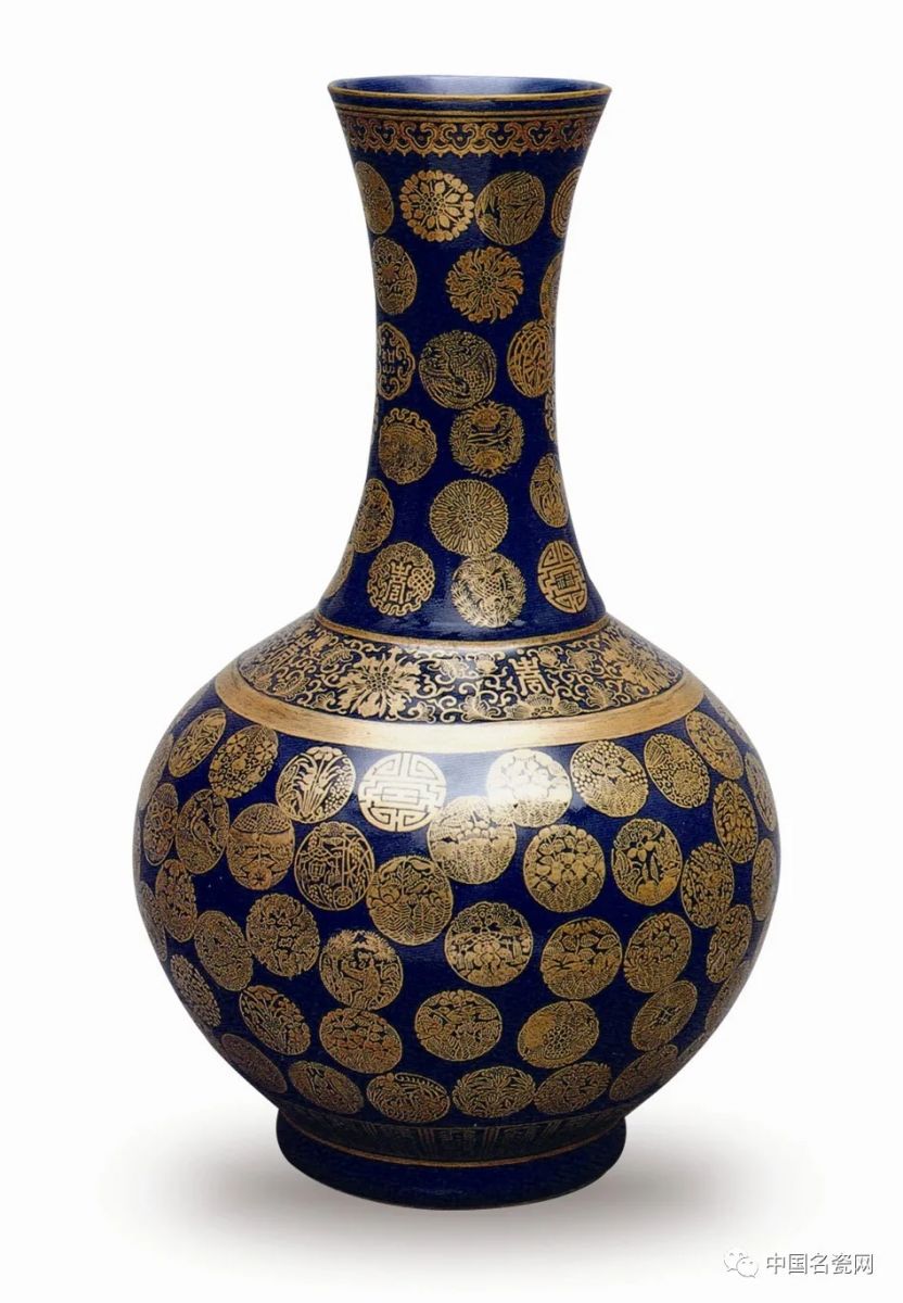 ....该器撇口,细长颈,肩部起弦,球形腹,圈足。通体施霁蓝釉,以金彩描绘各种纹饰,口沿绘如意纹,颈部和腹部绘各种团花,肩部绘缠枝宝相花纹和寿字纹,近底部绘仰莲纹。