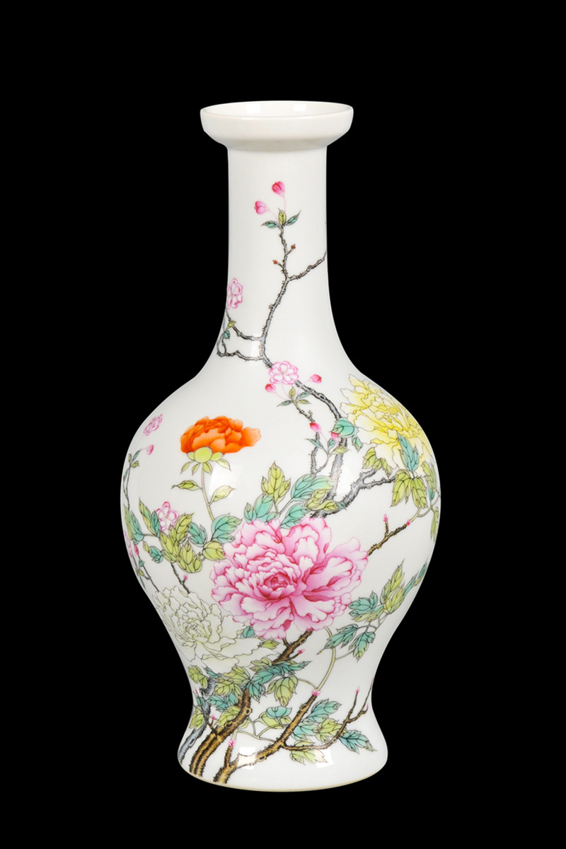 ....牡丹纹瓶造型优美,釉面莹润,通身以粉彩绘制牡丹花卉,花瓣轻盈舒展,或香艳盛开,或含苞待放。缀以深浅有致的绿叶衬托,画面透出浓浓的春意,充满着勃勃的生机。色泽艳丽,画工精湛,实乃一件令人赏心悦目的瓷艺精品,完美再现了雍正彩瓷清雅柔美的特质。