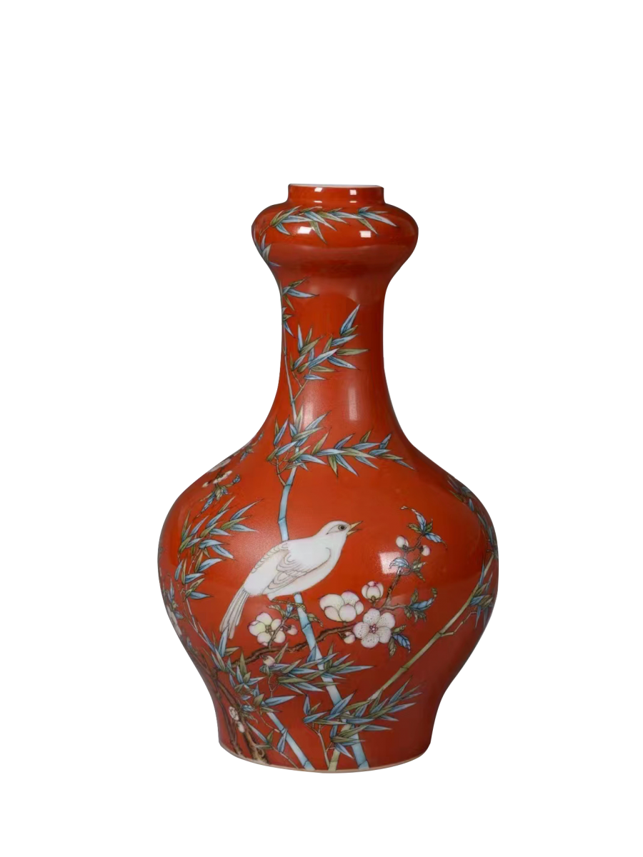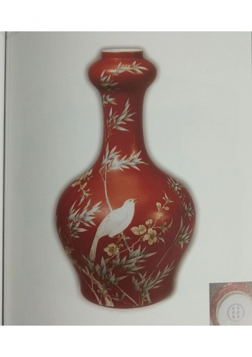 。。蒜头直口,长颈,圆腹。造型稳重端正。通体以珊瑚釉为地,瓶身上彩绘淡粉色桃花、翠竹与飞鸟。瓶底有“大清雍正年制”款。此瓶构图疏朗有致,绘画精细工巧,施彩鲜明,立体感强。