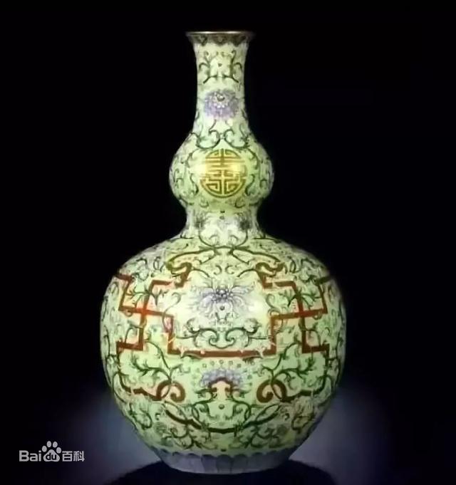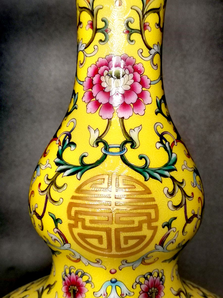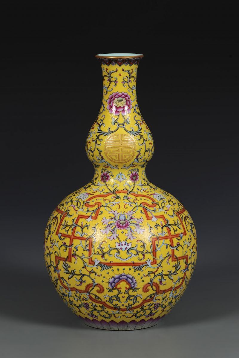 清乾隆 黄地粉彩万寿连年图长颈葫芦瓶