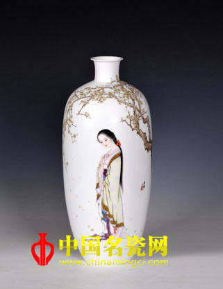 我伫立在这幅名为《独抱幽香》的瓷瓶前,恍然间,“香冷金猊,被翻红浪,起来慵自梳头。任宝奁尘满,日上帘钩”似乎映照了此时的情景。画面中的女子闲静如娇花照水,眼眸凝结处似有两处闲愁。红丝带轻绑乌溜溜的黑发,皓腕素手,淡扫娥眉,口如朱丹,一袭素色长锦衣,或增添了几许素雅。画面中没有过多的背景描述,几树遒劲盛开的梅花则是全部。我的驻足在于它的存在,它的存在却是印证我内心的一种寄托,在这样的一位女子身上仿佛看到了林黛玉似的人物情结。