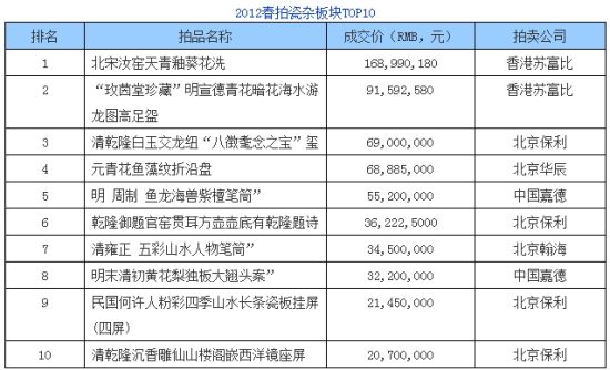2012春拍到6月底已基本结束,虽然从成交额和成交率上与以往不可同日而语,但也是惊喜连连,尤其是瓷杂古董,作为“国际硬通货”一直是春拍中的中坚板块,我们不妨来梳理下瓷杂板块的拍卖结果,细数下今年春拍中瓷杂板块中的那些高价拍品。