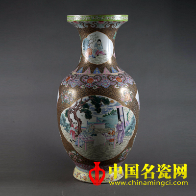 清 墨地描金开光人物盘口瓶