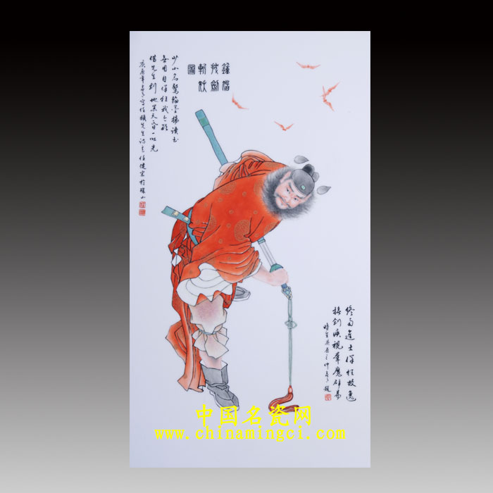 吉祥寓意:作品以墨彩描金的装饰形式为中国民间传说中驱鬼辟邪之神--钟馗造像,画中钟馗头戴纱帽,身披红袍,足踏朝靴,虬鬓髭髯。其躬身拔剑的动作中流露出浩然正气,也透出不凡的文采。人物头顶上几只飞舞的蝙蝠谐音“福”,喻含驱邪降福之意。