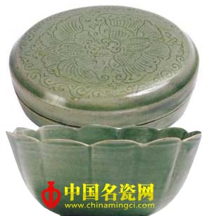 唐代烧制的越窑青瓷,初期胎质疏松呈灰白色,釉呈青黄色,多见剥落;中晚期大多胎土精细,不见夹层现象,胎表光滑致密,釉层也均匀纯净,厚润如玉。在装饰工艺上,普遍采用素地垂直划纹和堆贴花的手法。而宋代烧制的越窑青瓷,则较前朝的越窑青瓷更为功精器纯,不仅釉质清澈、釉色晶莹,其装饰手法更是多样,他们在继承前人工艺装饰精华的同时不断拓展,终使其装饰工艺更加完美,从而改变了越窑过去以素净为主的风格,因此无论是波浪、花草,还是人物、鸟虫,大都构图精细,更具宋代风格。