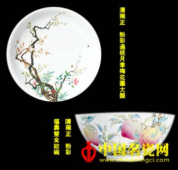 雍正粉彩无论在造型、怡釉和彩绘方面均得到了空前的发展。粉彩是雍正彩瓷中最著名的品种之一,彩料比康熙朝的要精细,色彩柔和,皴染层次多。大多数在白地上、少量在色地上绘纹饰。以花蝶图为最多,牡丹、月季、海棠、四季花也极为普遍。人物故事图,在粉彩中也比较多。此外,粉彩瓷中谐音的“蝠”(福)、“鹿”(禄)图案十分多见。当时突出的是所谓“过枝”技法。 不仅大型器规整不变形,小型器各部位处理严谨得当,反映当时制作技巧的高超。其青花款识六字二行者为专人书写,字体工整有力,青花色调纯正。六字三行者书写草率,而青花花押款、斋堂款则比较稀少。