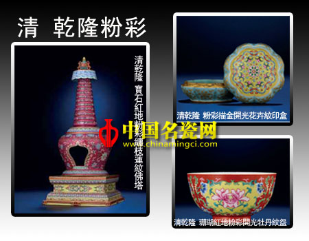 乾隆时期的粉彩的特征明显,总结起来主要表现在几个方面:首先在用色和施彩的工艺方面有了新的发展,除以粉彩绘画为主,还常加绘料彩、金彩或黑彩,或与青花五彩、斗彩并施于一器。其次,在装饰方法上出现多种色地“开光”粉彩,如红、黄、蓝、绿、紫及多种色釉为地,可达十多种。第三,乾隆粉彩利用粉彩粉润柔和的质感,用粉化的各种彩料仿制各种工艺品。第四,乾隆粉彩有一个独有的特征,即器物口部及底部都施松石绿釉。第五,乾隆官窑粉彩的纹饰一般是“大内”送来的图样,主题纹饰按不同时节都有严格规定。第六,乾隆粉彩的造型工艺更是精益求精,不论是高达一米多的大型陈设瓷,还是小至几厘米的扳指、鼻烟壶,造型都非常规整,很少出现夹扁或歪塌现象。