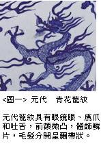 例如图一为元代的青花龙纹,此龙位于元代青花扁壶上,该器的壶身略呈上宽下窄的梯形,表面用云头纹区隔出二种纹饰题材,在云头纹内部绘满繁密的缠枝花卉纹,并有两隻凤鸟穿梭其间;而在云头纹以外的器表上,则有两个龙纹以一升一降、左右并列的形态,戏耍于波涛之上。我们从图中所撷取的局部特写里,看到元代龙纹以粗细并用的线条勾勒出张口吐舌、拱身舞爪的形象,长条状的毛髮分散飘扬,以富有律动的线条呈现出活泼生动的风格。相同的龙纹也可见于土耳其托普卡比宫博物馆所收藏的青花飞龙纹扁壶上,虽然该器的壶口改用金质套管,肩上双繫也已缺佚,但是壶身仍旧完好,表面除了有云头纹包围的缠枝花卉之外,正中处描绘一个龙纹,独自飞舞于波涛上方,龙纹的肢体灵活弯转,长鬚和毛髮冉冉飘扬,从它的眼镜眼、鹰爪、吐舌、前额微凸、体施鳞片及分开飘带状的毛髮来看,都是元代龙纹的典型特徵。
