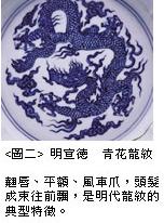 例如图二为明代宣德朝所製作的青花葵口盘的局部特写,盘的内底以青料描绘一个昂首挺胸、跨步行走的游龙,身边缀以云朵,犹如在云中翻腾一般。龙首部份维持眼镜龙的形式,然而嘴巴闭上,唇部向上翘起,额头较平,头上的毛髮成束往前飘,身体表面以青料涂绘一片片的鳞片,五根脚爪分布均匀,好似风车一样,整体风格显得颇为稳重。而这种眼镜眼、翘嘴唇、平额头、风车爪及成束往前飘的毛髮,正是明代龙纹的最大特徵,如北京故宫博物院所收藏的宣德朝青花瓷中,即有不少以龙纹为饰的钵、碗、杯、盘等器物,都具有上述的特质。不过,到了明代嘉靖时期以后,青花龙纹在绘画技法的改变下又有一些变化。