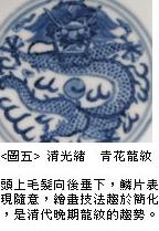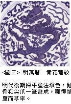 例如图三为明代万历朝青花盘的局部特写,图中所示的龙纹绘于圆盘的内底,龙首仍是斜角侧视像,头上的毛髮成束往前飘,张开的五爪如同风车,造形与宣德时期近似。但是龙纹的身体以简单的线纹勾勒鳞片,再用长笔平涂法填上均匀的颜色,趾骨和尖爪部份一笔画成,内部也填上相同的色彩。这种简化的笔法与平涂式的填色方法,让明代后期的龙纹显得比较草率,例如在北京故宫博物院的藏品中,属于嘉靖、隆庆、万历的青花瓷器,即有不少龙纹呈现如此的简化风格。