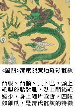 清代的青花瓷器既有模彷明代的彷古作品,也有当代创新的款式,这种现象自然也反映在龙纹的製作上,不过清代的彷明龙纹大多有形无神,无法与明代龙纹相比,但是当时所设计的新式龙纹,却因为有了全新的气象而成为此一时代的象徵。清代的新兴龙纹一改明代晚期的简单草率,以更加威猛、更加写实的形象出现。此处因为缺乏青花龙纹图片,所以暂时用图四所示的黄地绿彩龙纹来做说明。